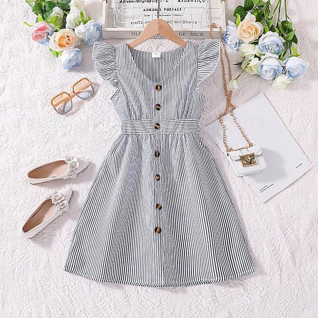 Gender: Girls', Age Group: Kids, Style: Sweet, Princess, Beautiful, Occasion: Beach, Vacation, Holiday, Daily, Kids Apparel: Ruffle Dress, Dress, Fabric: Polyester, Pattern: Striped, Sleeve Length: Sleeveless, Design: Ruffle, Age: 4-12 Years, Look After Me: Hand wash, Season: Summer, Dress Length (cm): Knee-length, Fit Type: Regular Fit, Dresses Type: A Line Dress, Casual Dress,