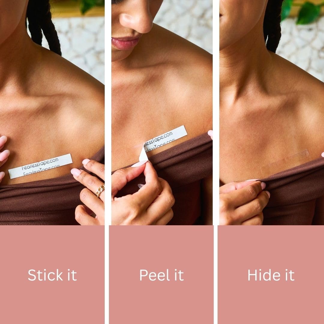 - Gentle on Skin & Hypoallergenic Adhesive - Our double sided body tape features medical-grade adhesive that's gentle enough for sensitive skin while providing all-day hold. This skin tape creates an invisible barrier between fabric and skin, perfect for backless dresses, plunging necklines, and strapless tops. Unlike harsh sticky tape alternatives, Fearless fashion tape removes cleanly without irritation (patch test recommended).