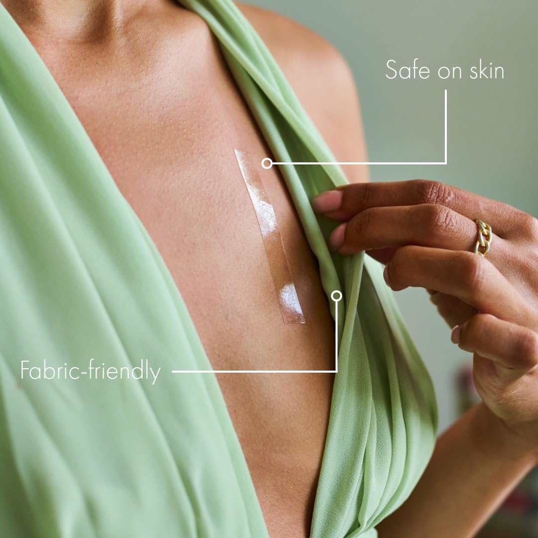 - Secure Your Fashion with Double Sided Clothing Tape - Professional fashion tape for women keeps dresses, tops, blouses, and all clothing perfectly placed all day. This clear body tape works as dress tape fabric to skin, bra tape, and garment tape for any outfit. Each pack includes 50 strips of 1/2" x 3" transparent tape for maximum coverage and versatility for fashion emergencies.