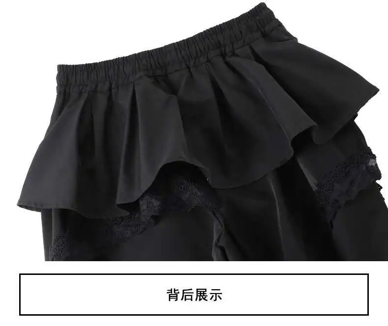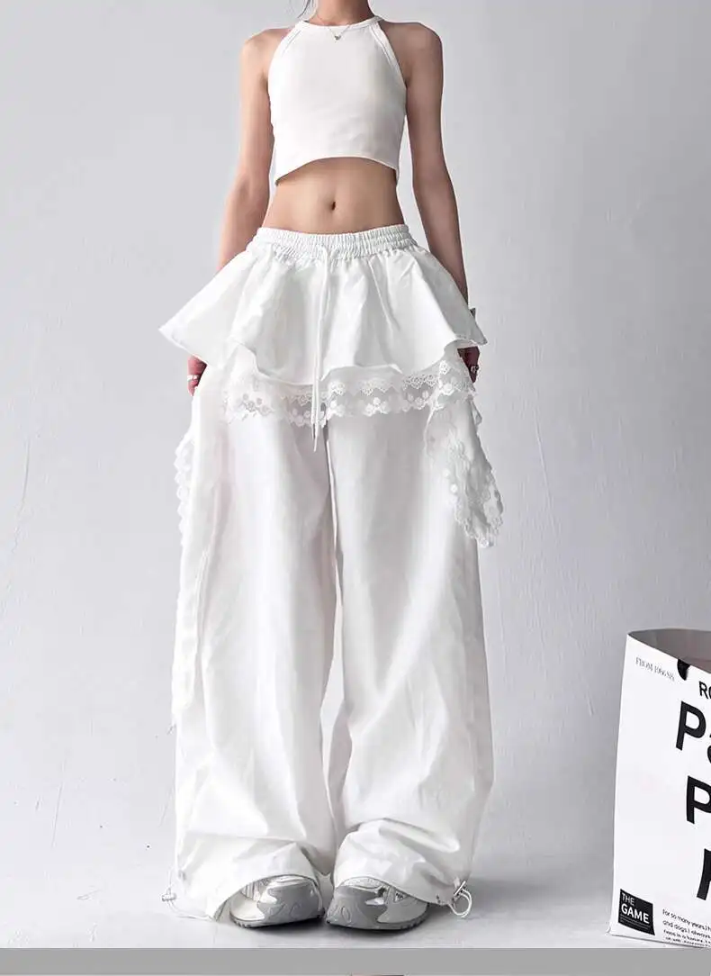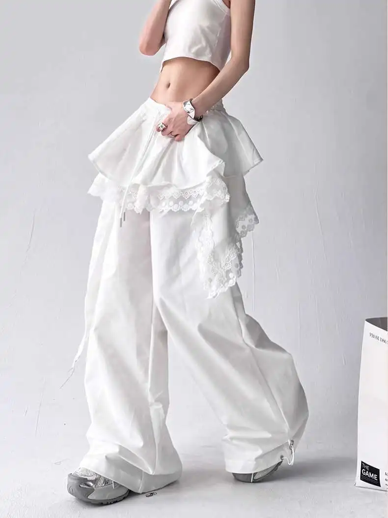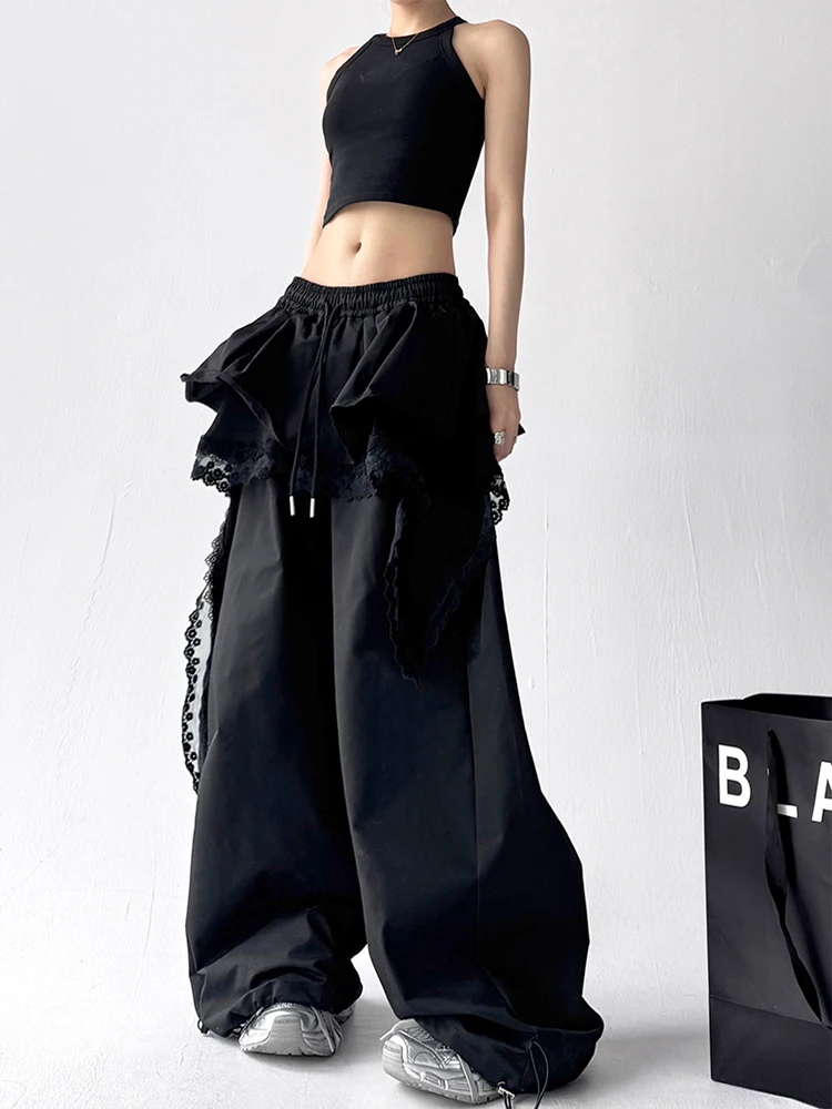 Y2K Black Cargo Pants Women Lace Patchwork White Wide Leg Pants