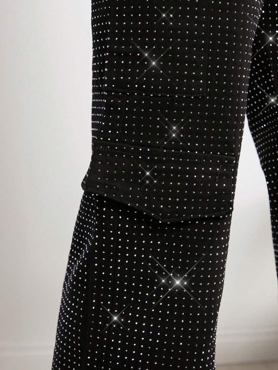 Mid Waist Black Rhinestone Cargo Jeans for Women – Chic Multi-Pocket Casual Style for Winter and Fall Events