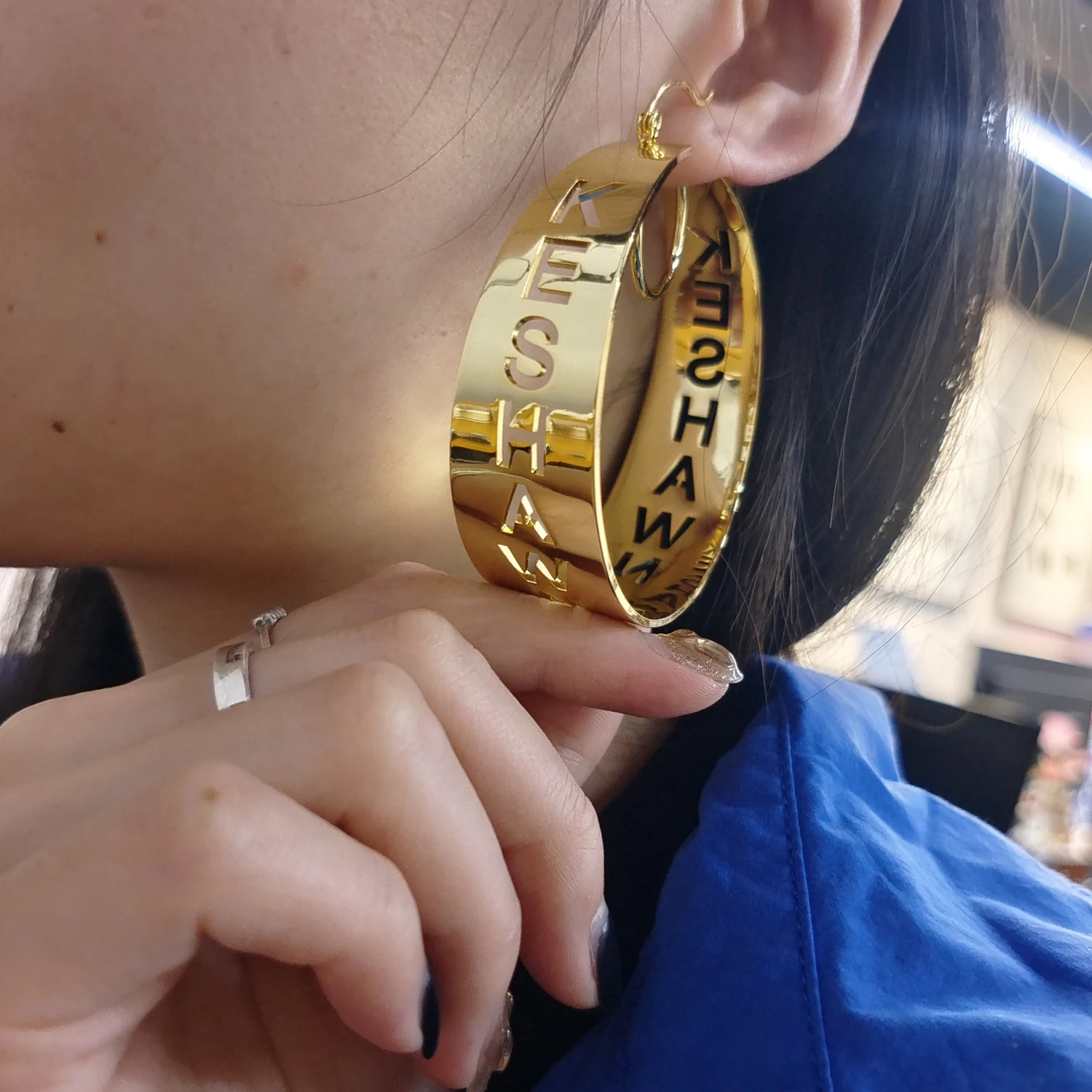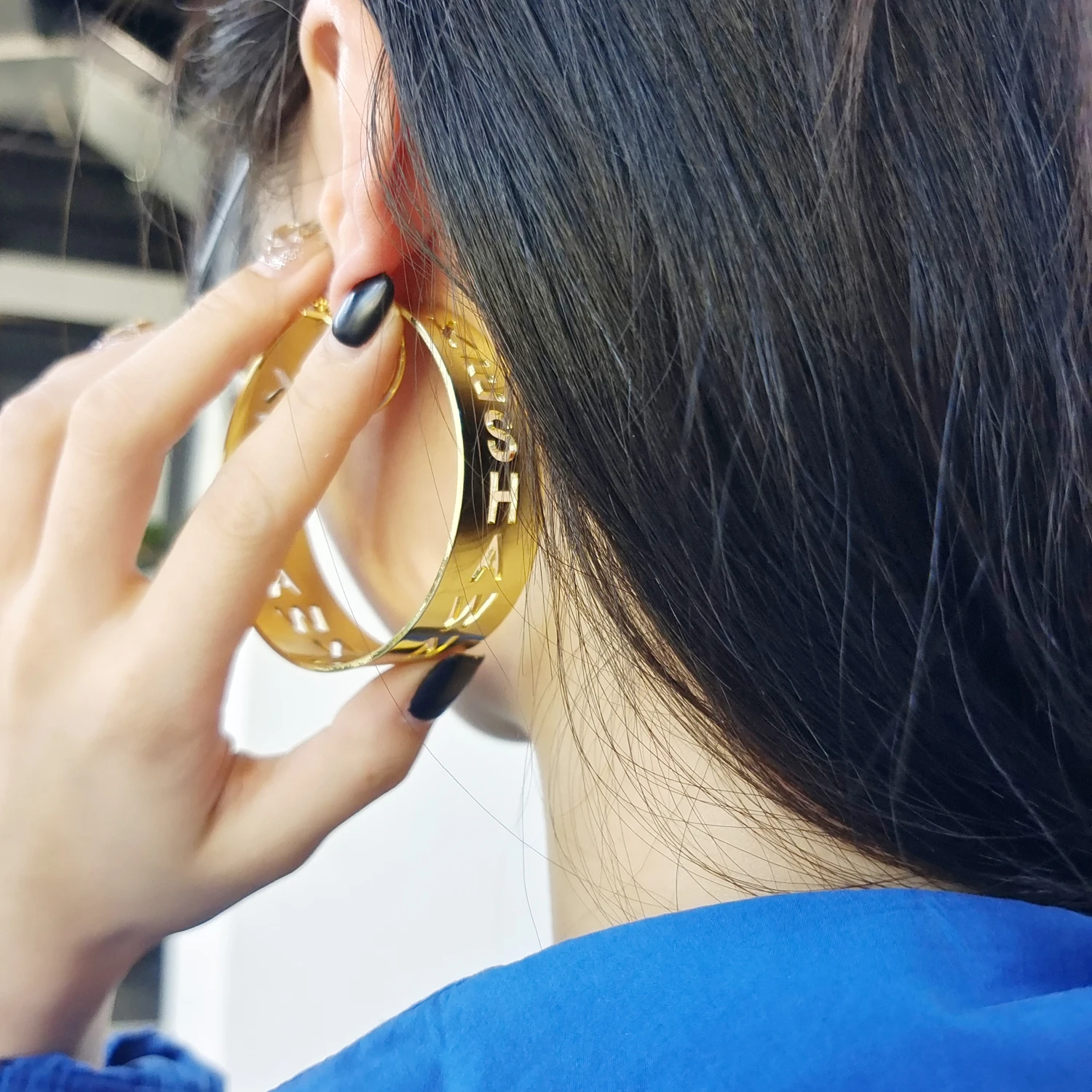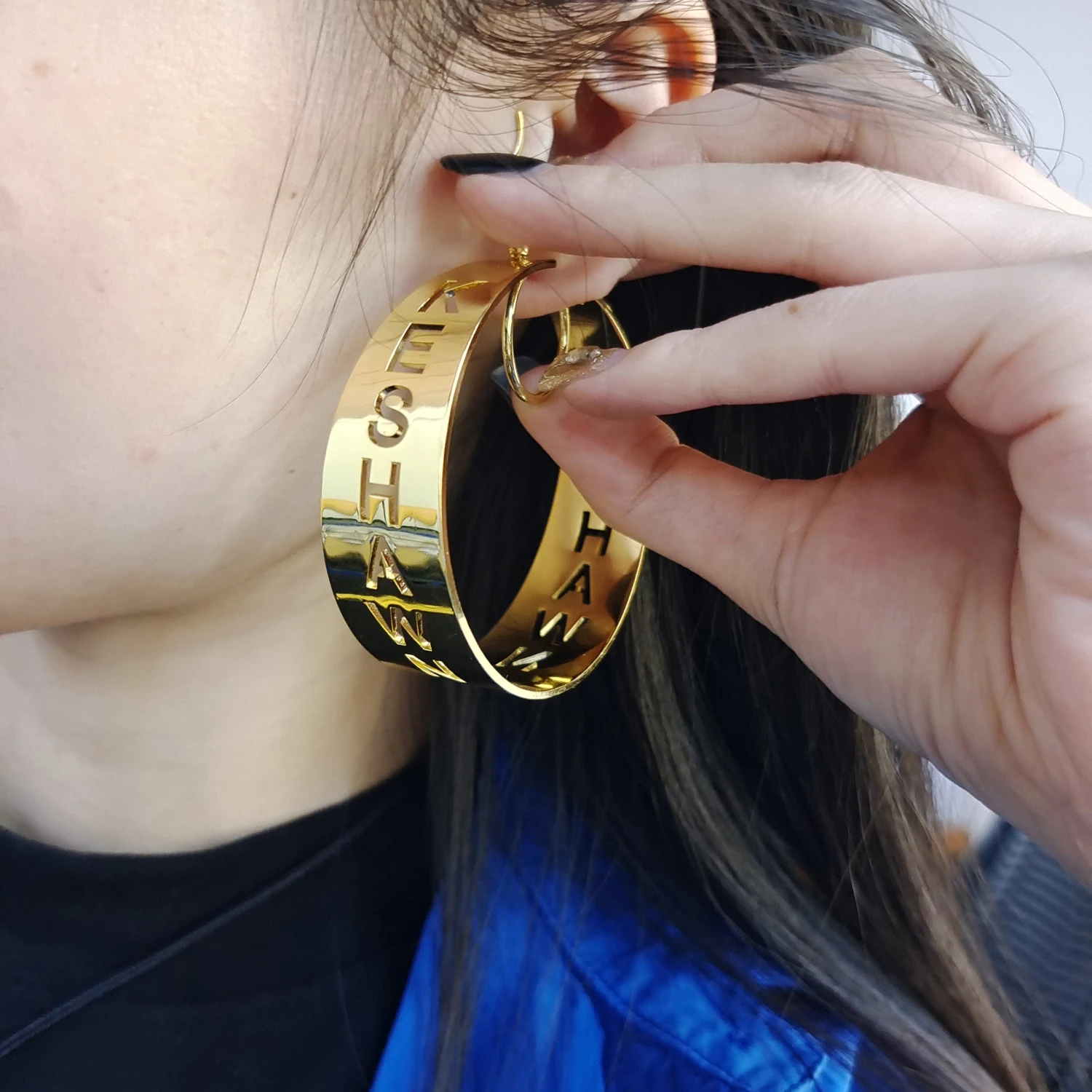 Elevate any outfit with MYDIY's custom letter earrings. Made of high-end stainless steel, these hoop earrings feature a unique hollow design and can be personalized with your name. A thoughtful gift for a loved one or a luxurious addition to your own jewelry collection.