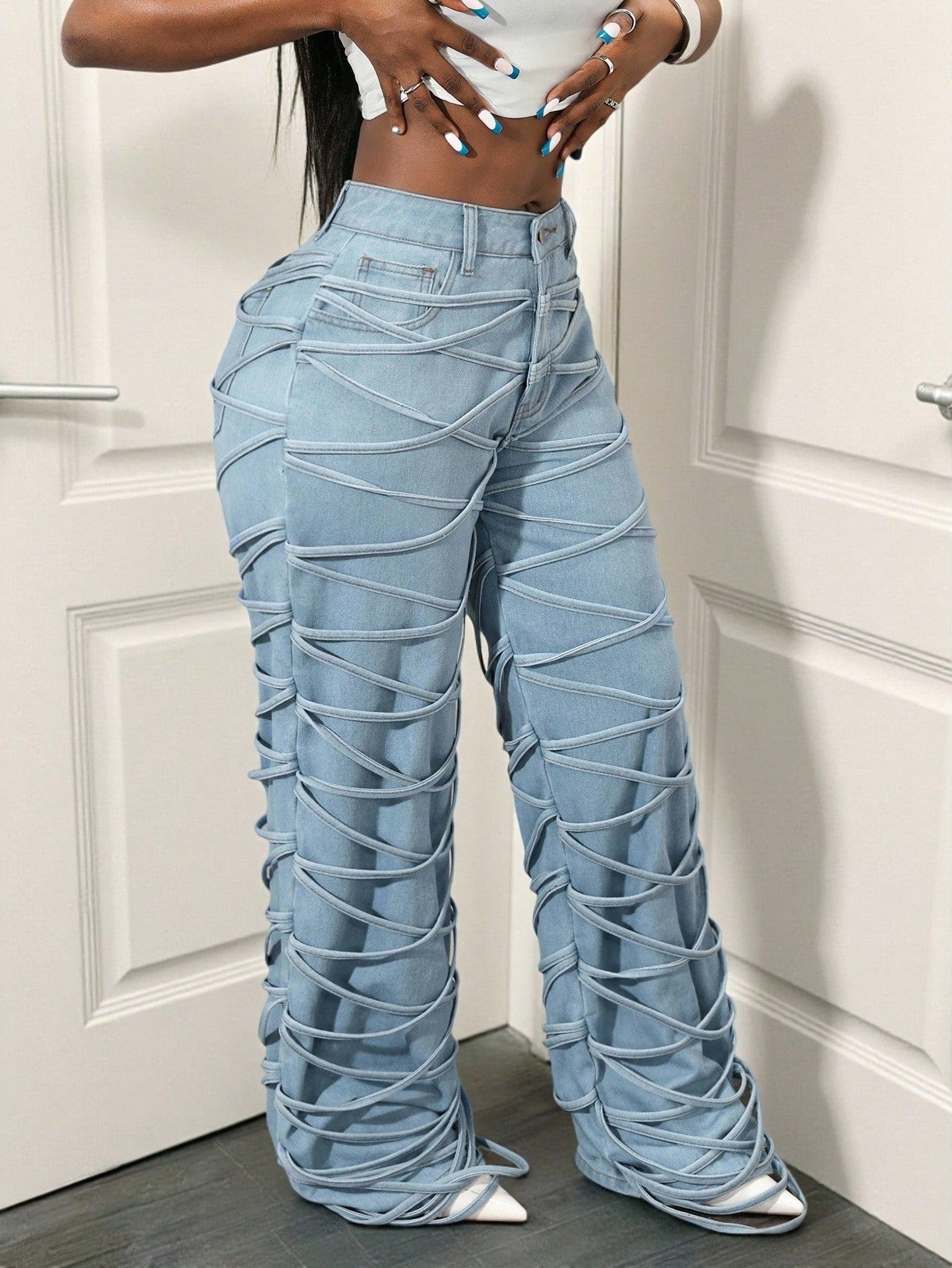 Personalized Lace-Up High Waist Straight Leg Jeans for Women - Trendy Fall Fashion