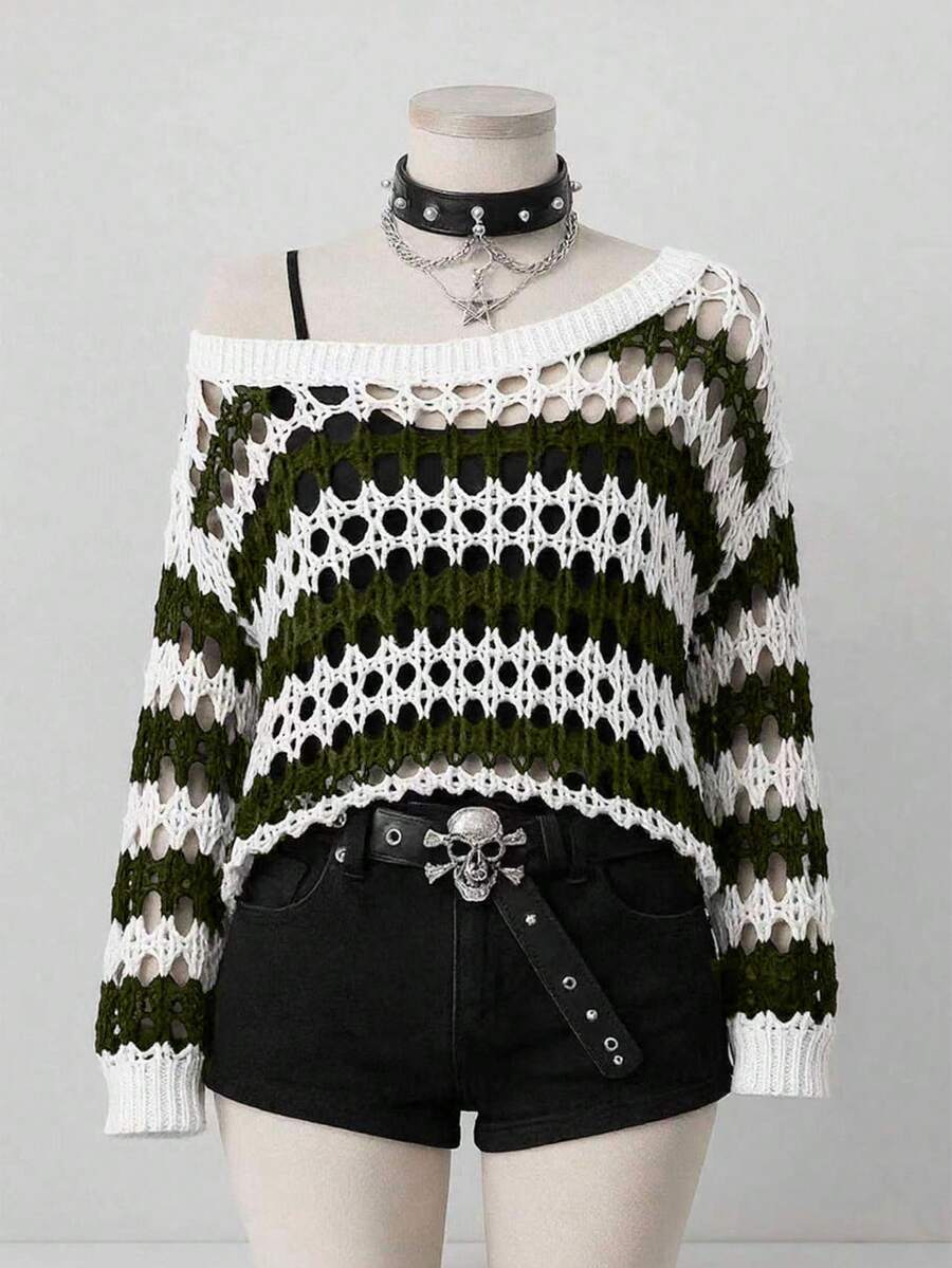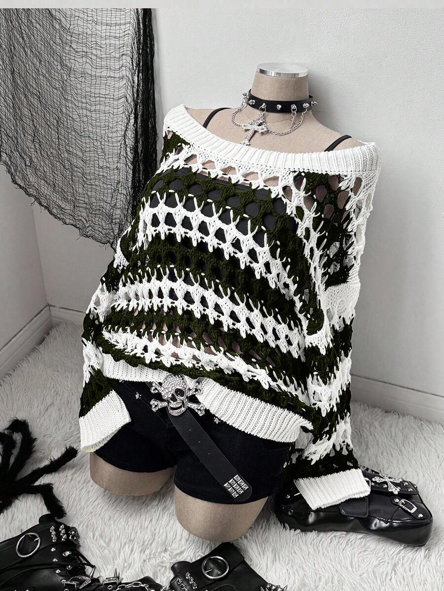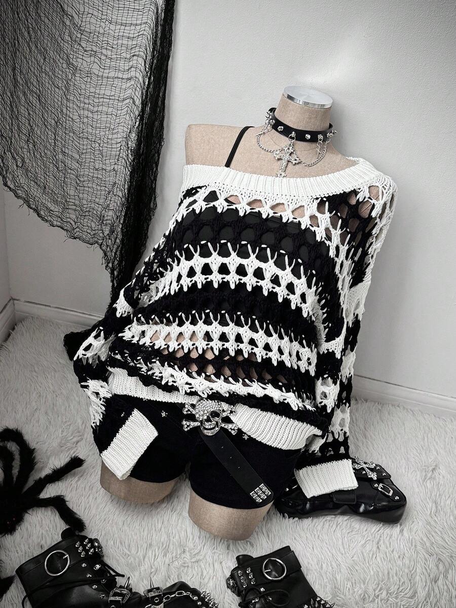 Plus Size Y2K Hollow Out Knit Sweater for Women - Stylish Black & White Crochet Design for Spring, Summer, and Autumn