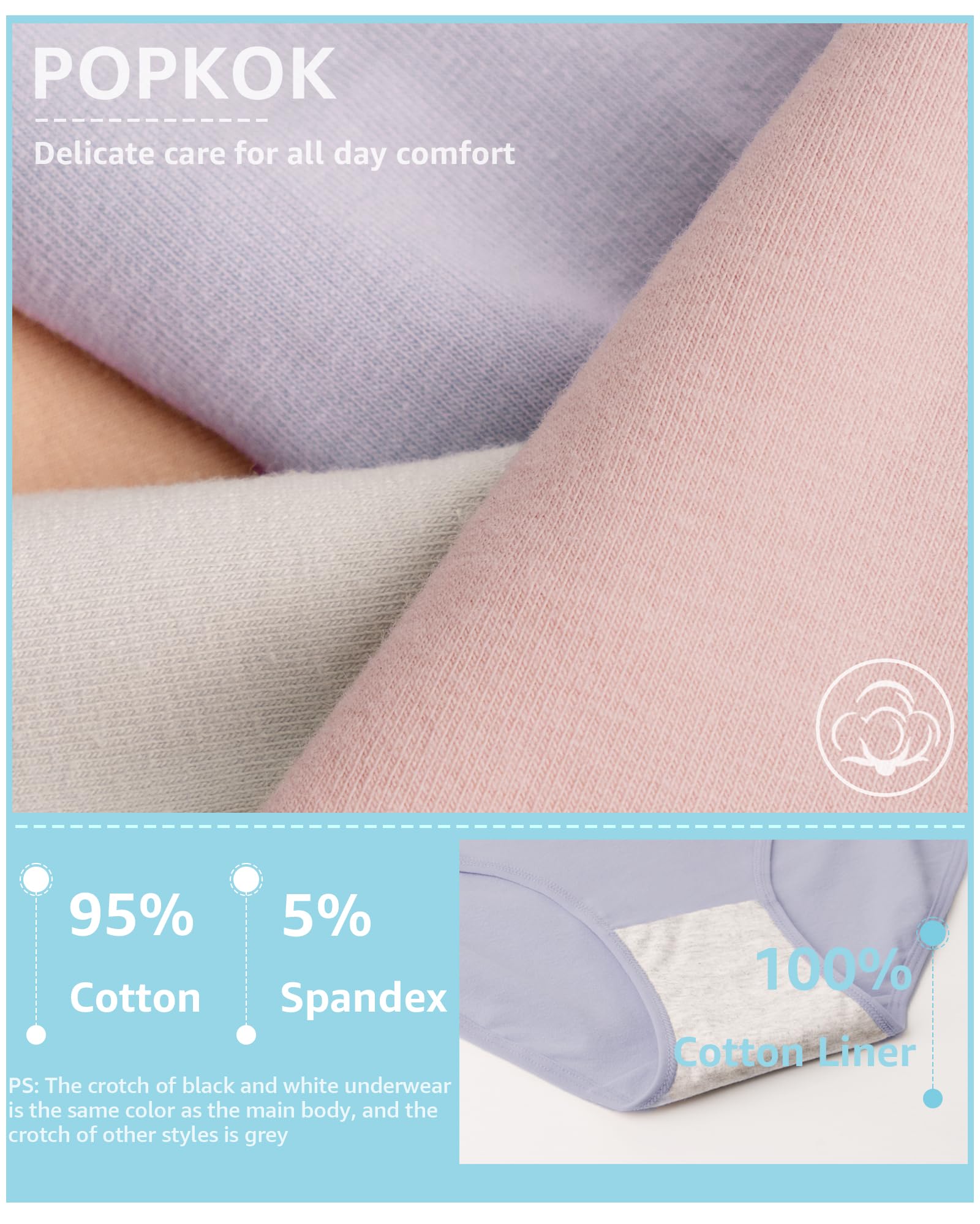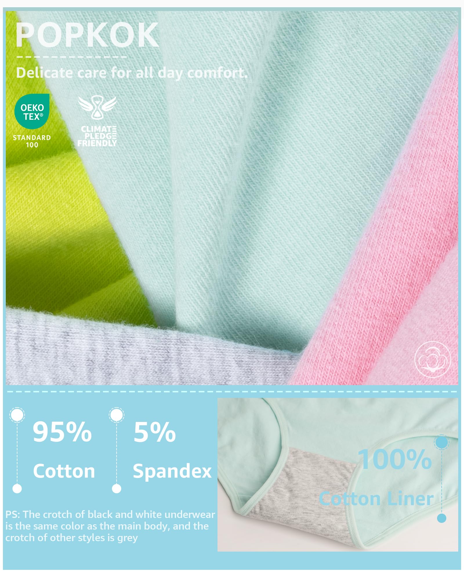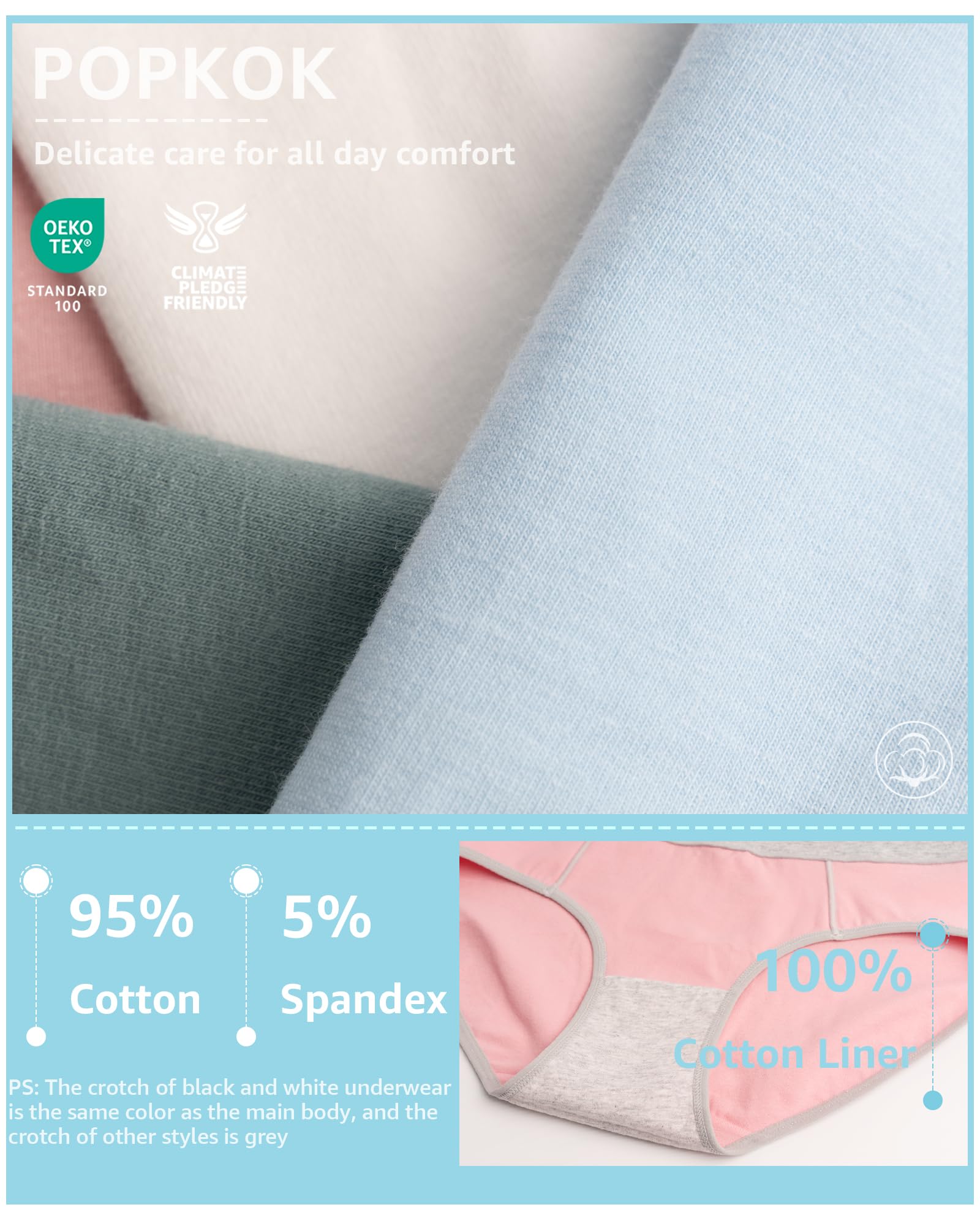 - SELECTED HEALTHY FABLIC: POPKOK teen girls cotton underwear, made of 95% premium cotton and 5% spandex, which combine softness and breathability, are friendly to the skin, and will keep comfortable and dry all day long. Also, there is an extra 100% cotton layer in the crotch area for added softness protection.