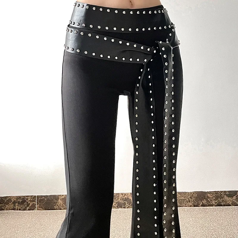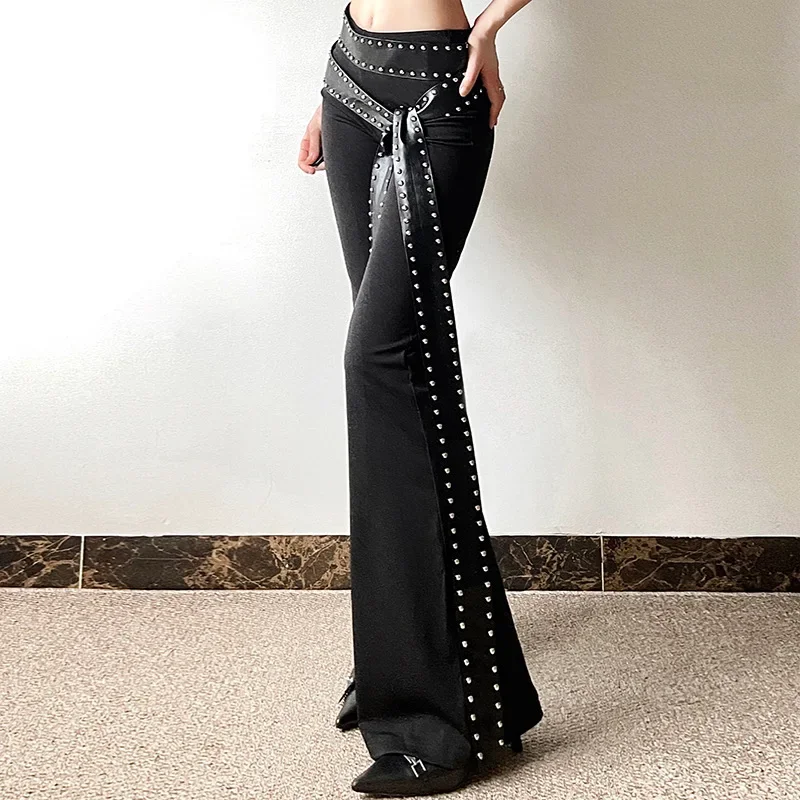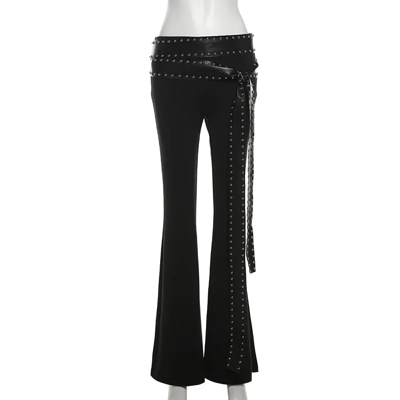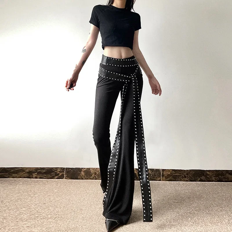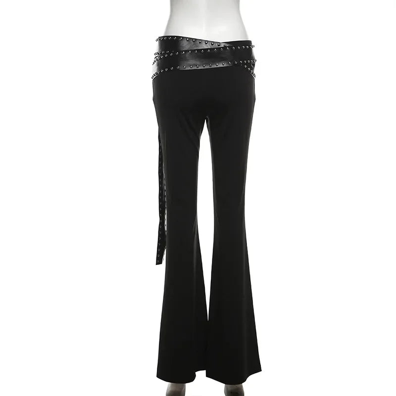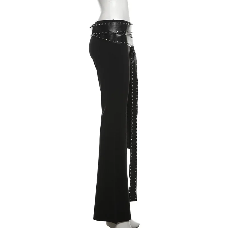 Punk Grunge Hoge Taille Flare Broek Effen Alt Streetwear Vrouwen Mall Gothic Casual Broek Met Kunstleer Riemen Slank