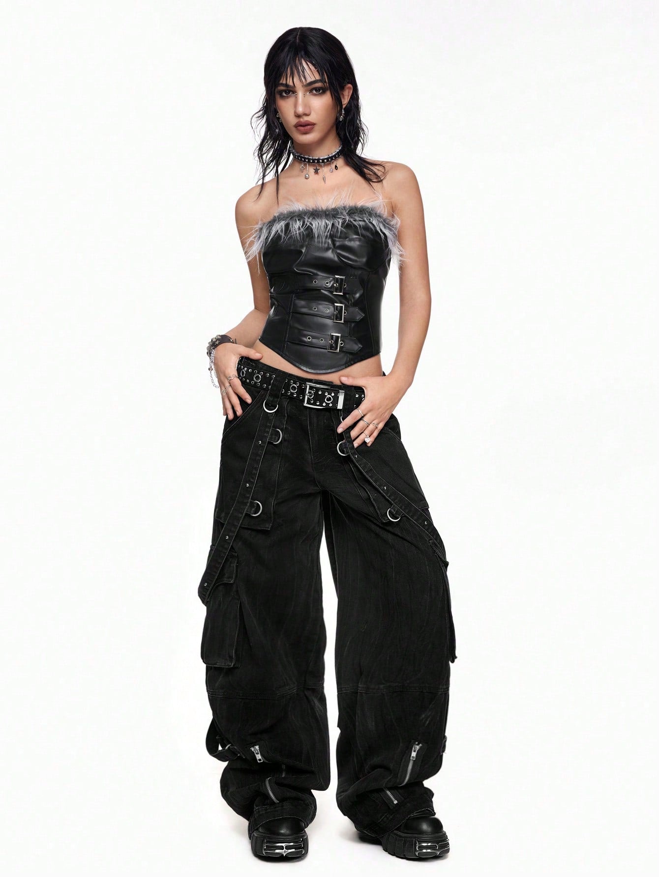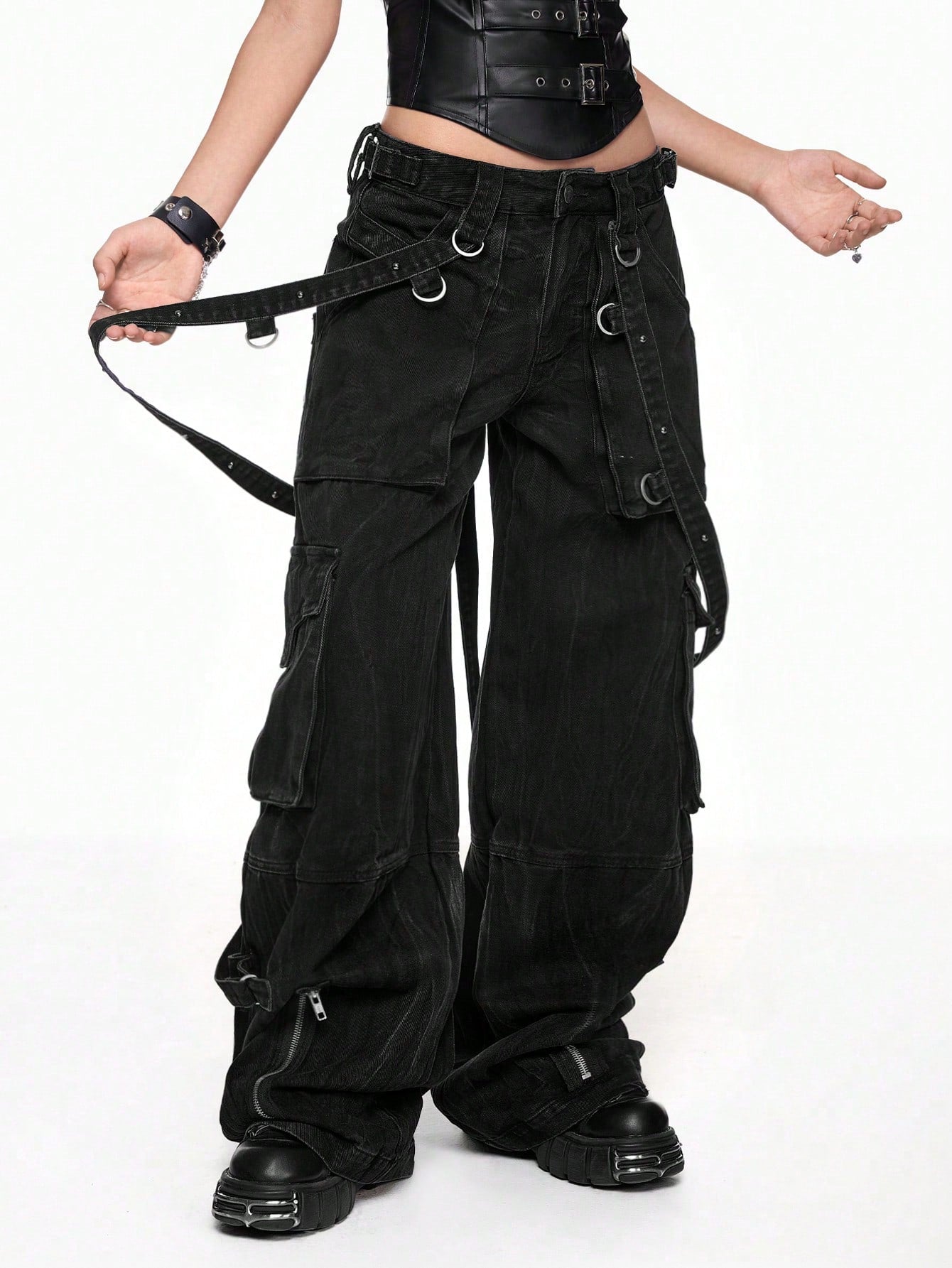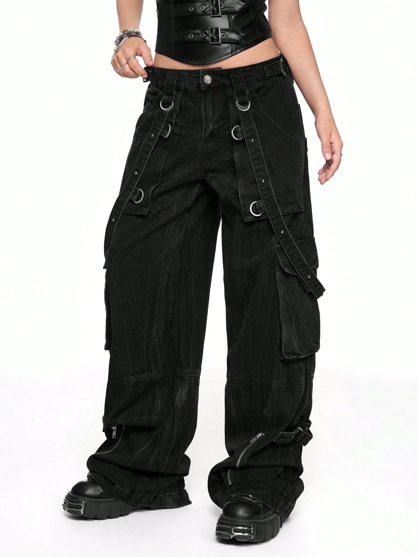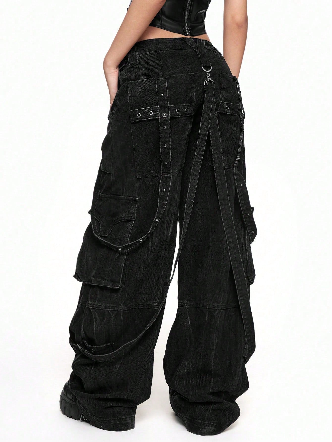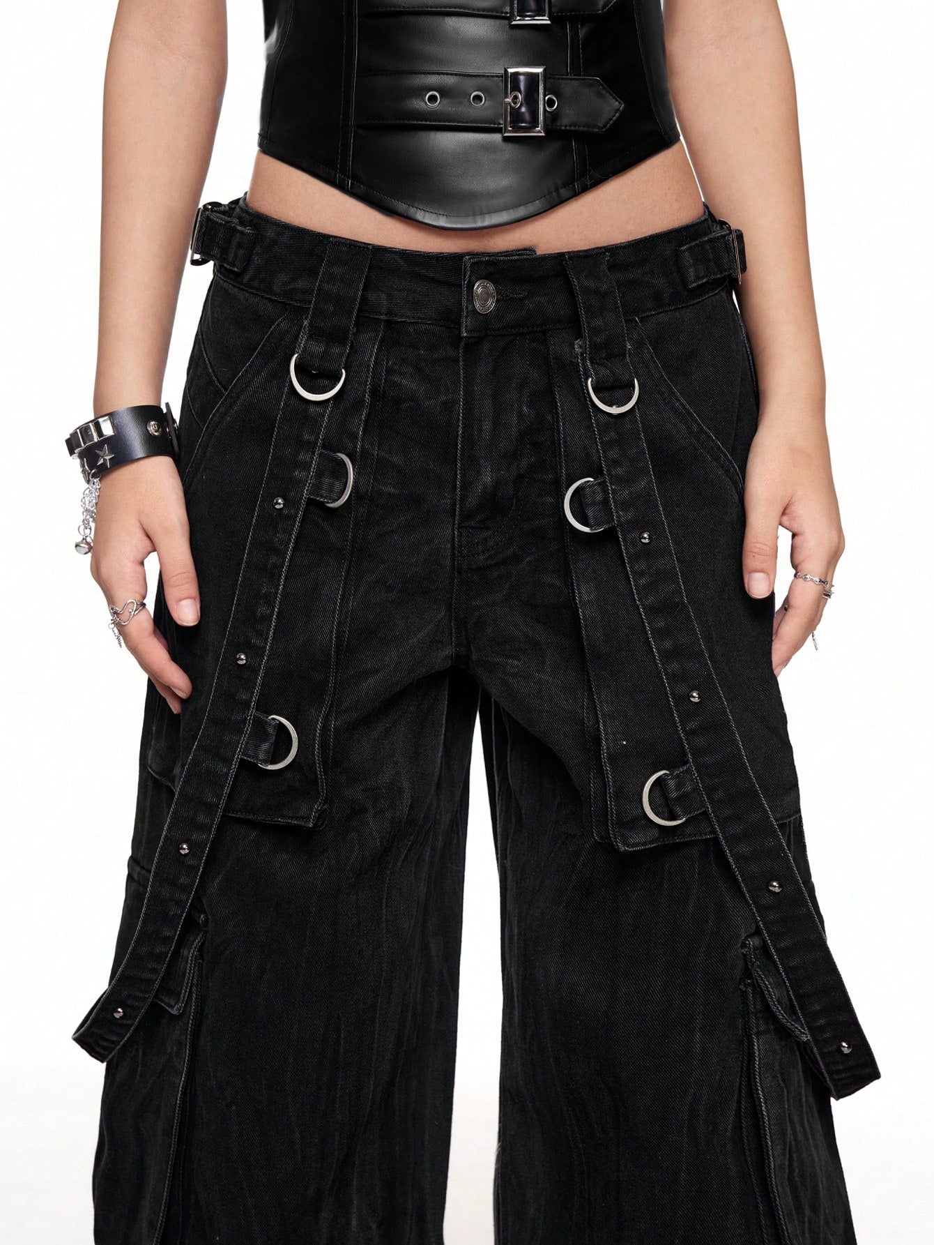Punk Retro Grunge Wide Leg Cargo Jeans for Women - Low Waist Boyfriend Fit with Rivet Webbing