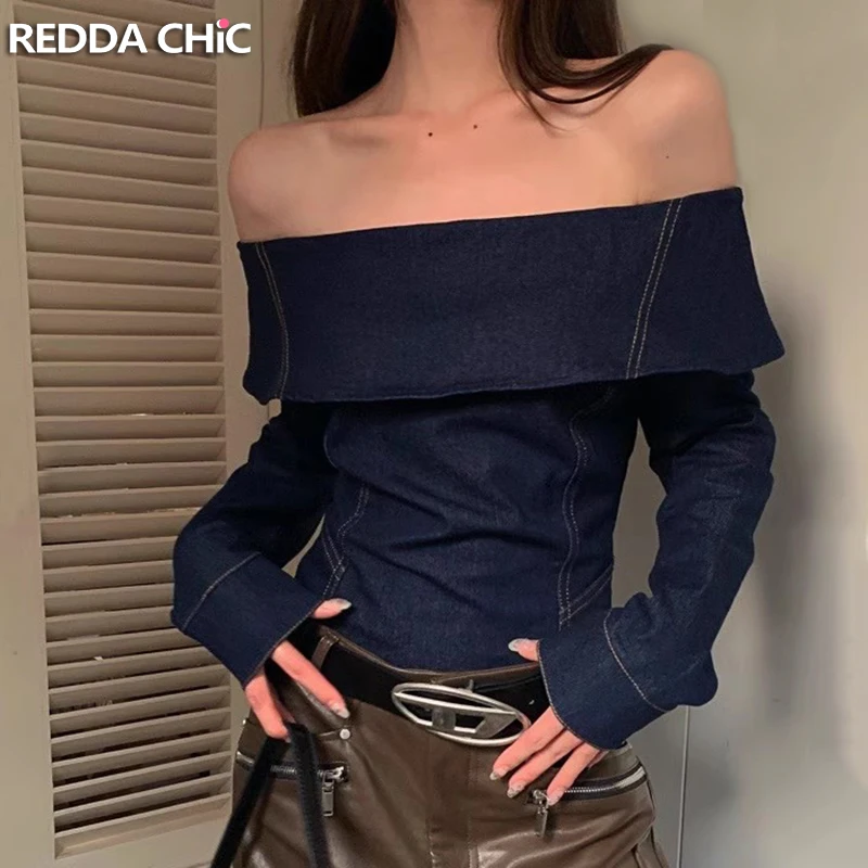Denim Off Shoulder Blouse Top Plain Blue Long Sleeves T-shirt