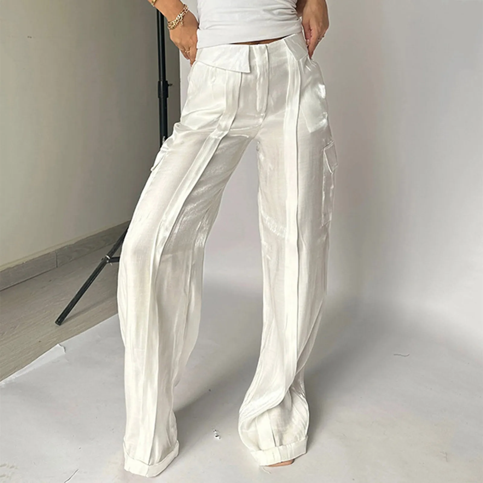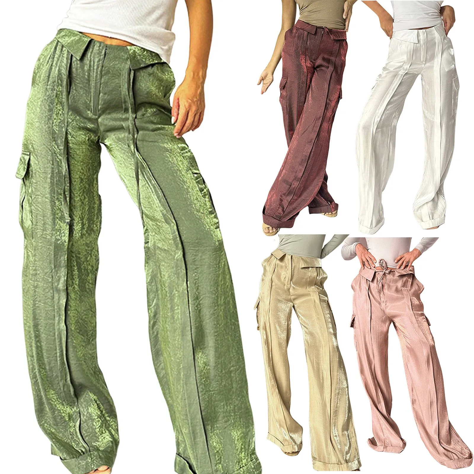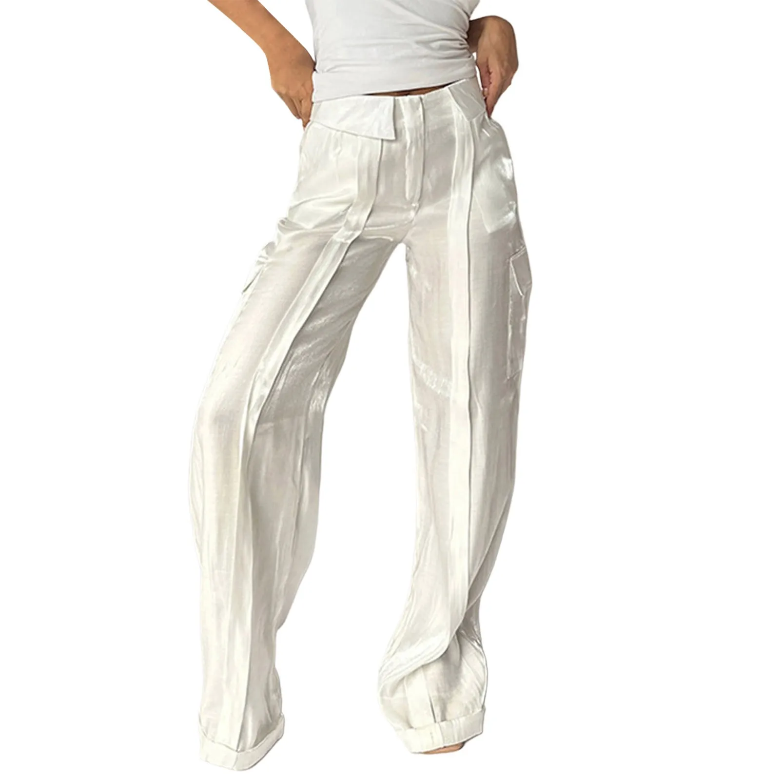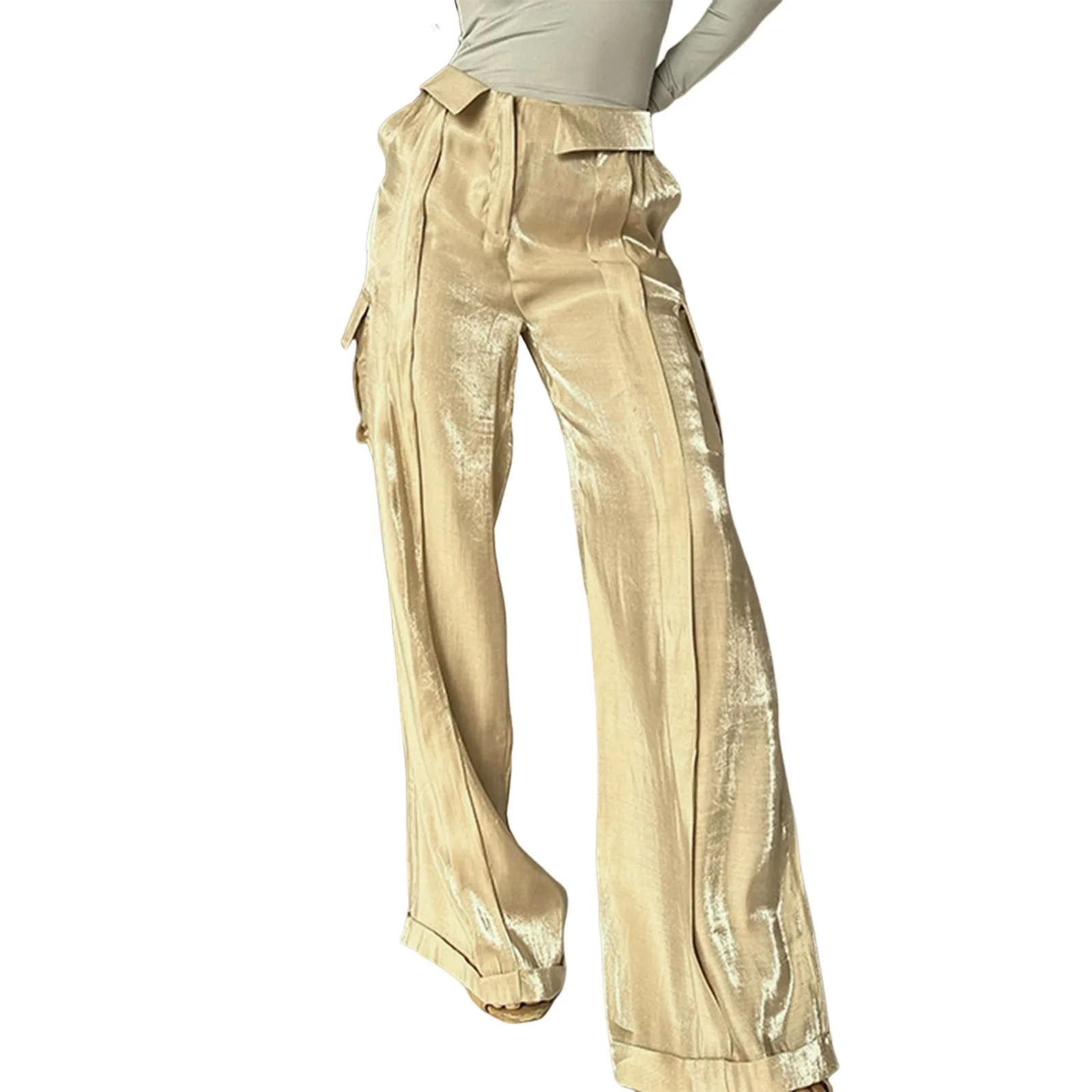Women's Spring Glossy Silk Baggy Pants Elegant High Waist Zipper Straight Trousers Monochrome Pocket Sweatpants