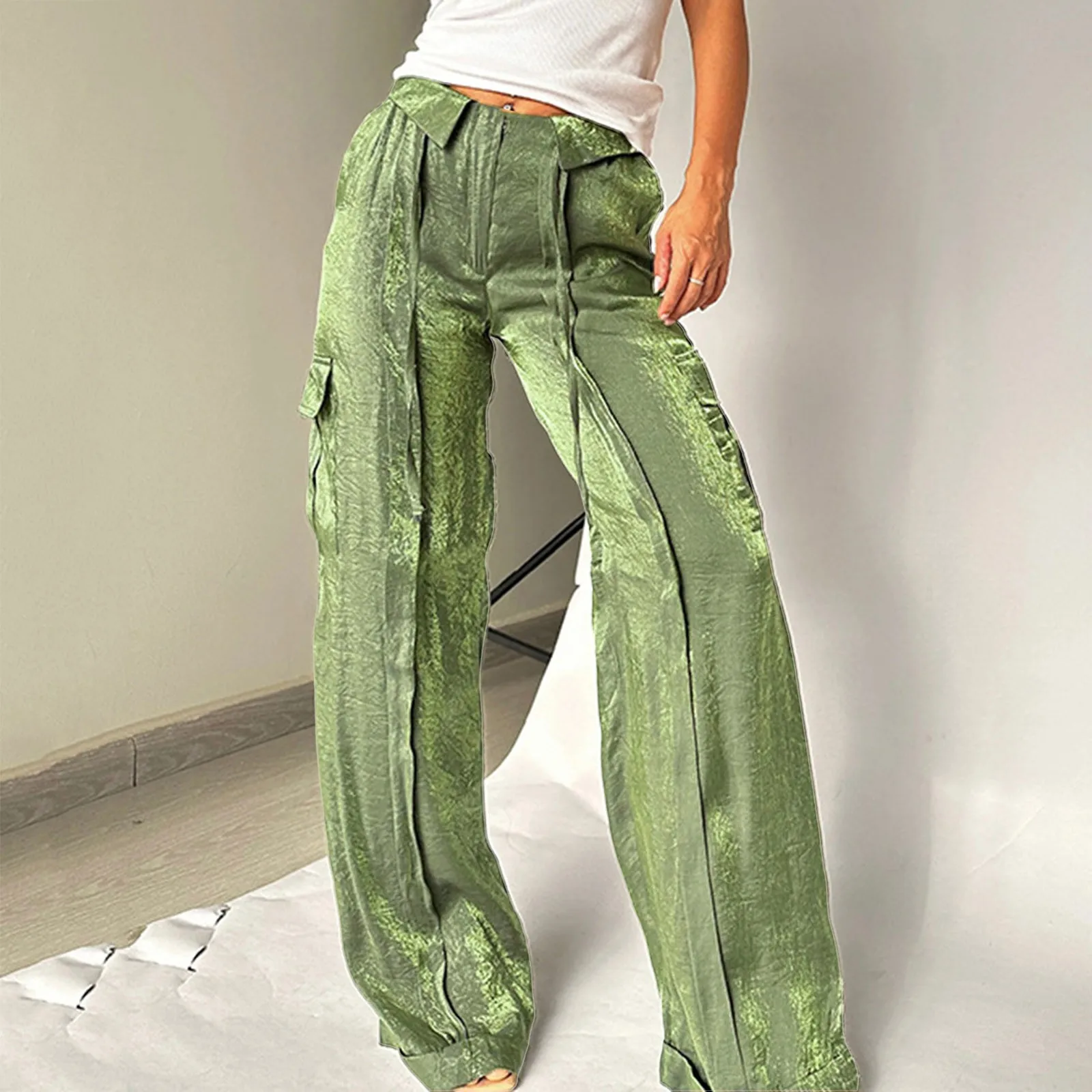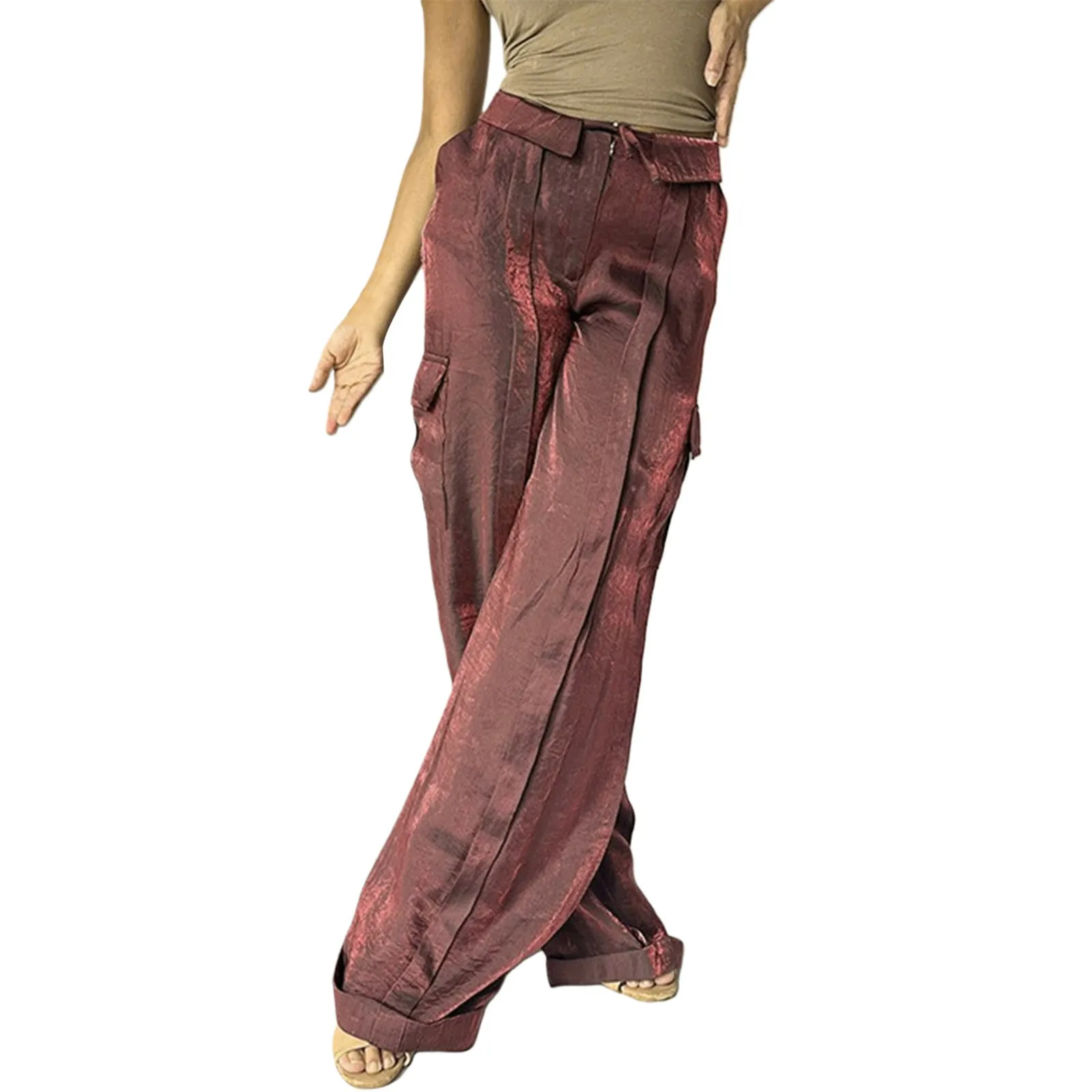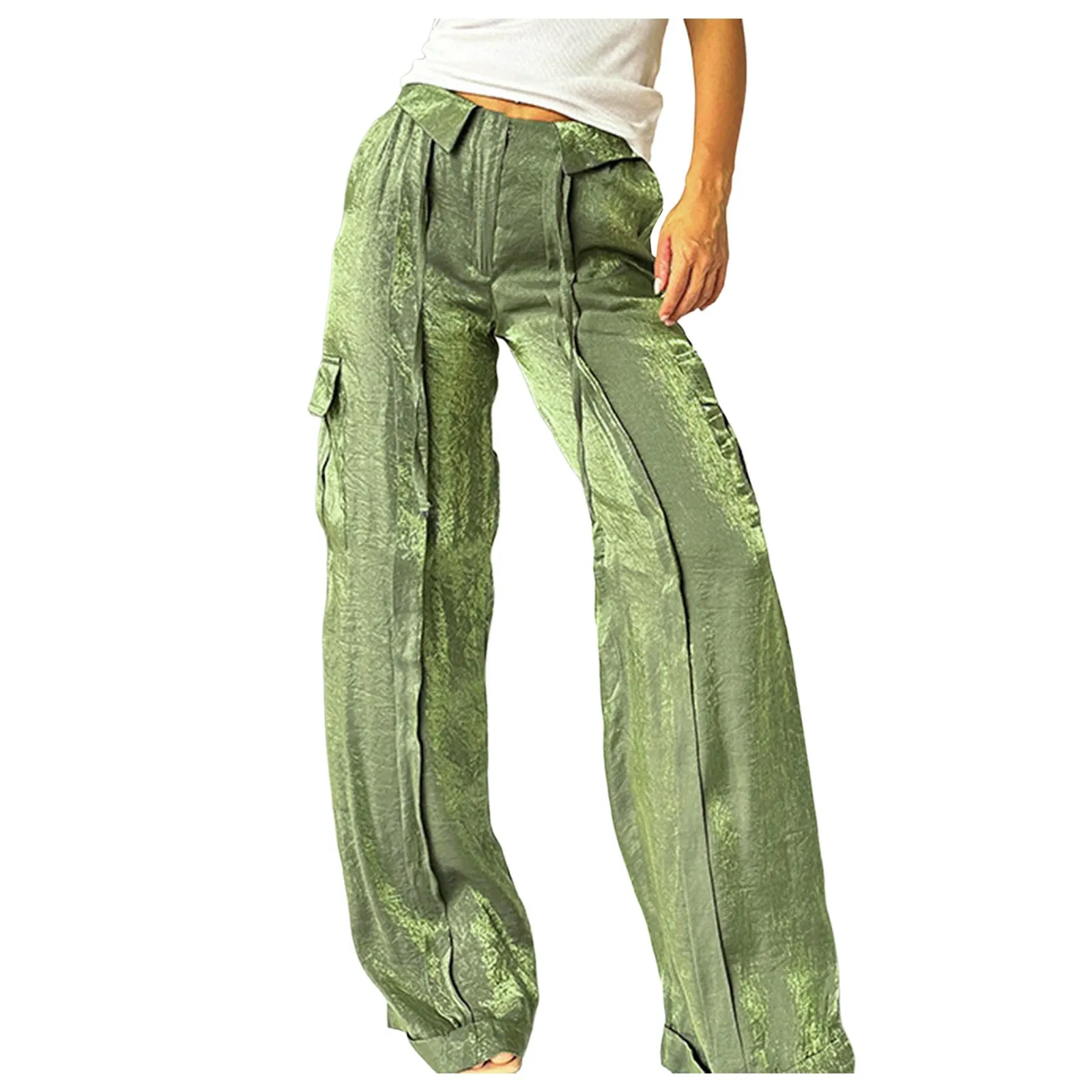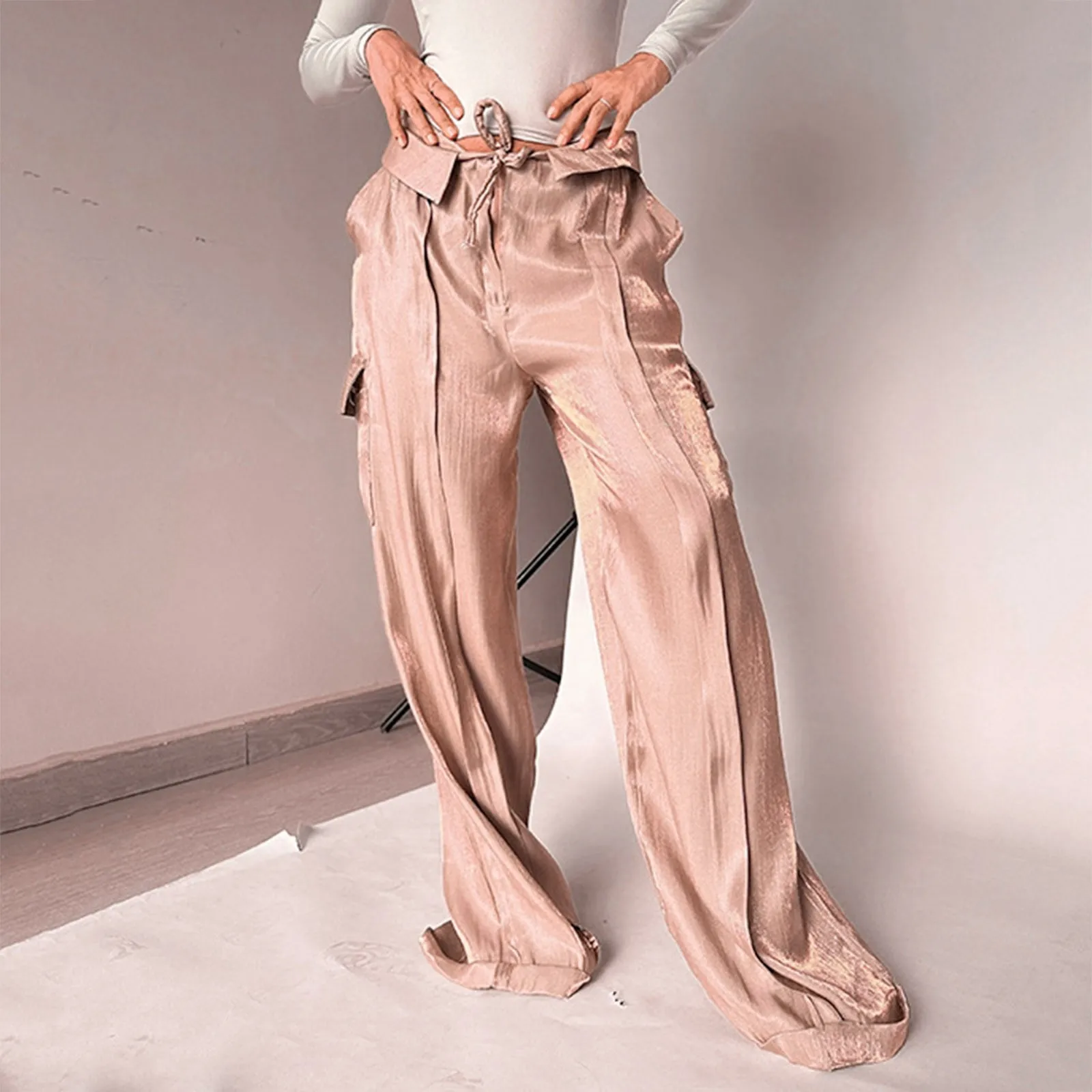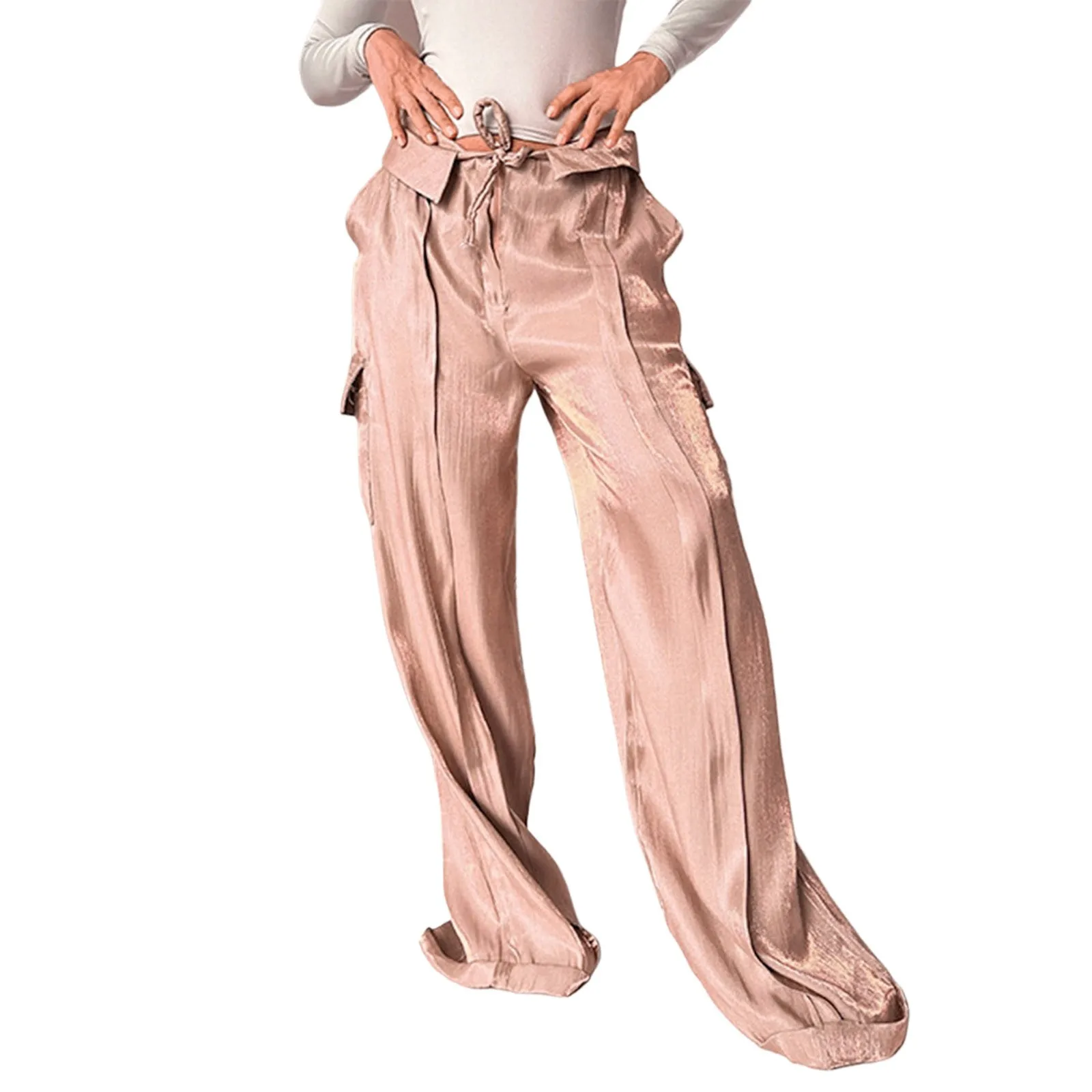 Women's Spring Glossy Silk Baggy Pants Elegant High Waist Zipper Straight Trousers Monochrome Pocket Sweatpants
