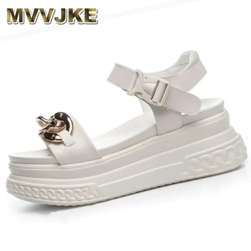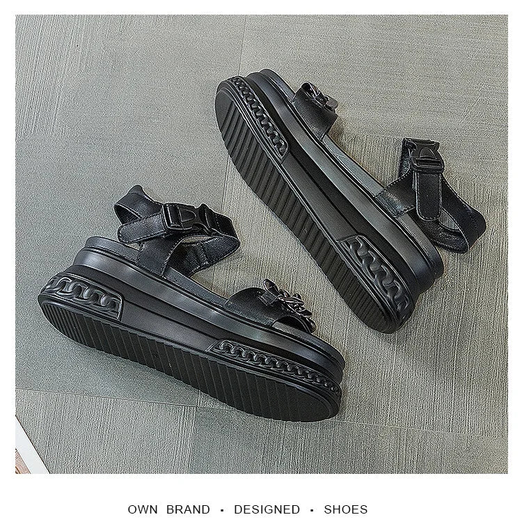 Elevate your summer style with these sophisticated high-heel platform sandals crafted from genuine leather. The distinctive chain detailing and Roman-inspired design offer a contemporary interpretation of classic elegance. Expertly constructed to provide stability and comfort despite the height, these versatile sandals transition seamlessly from day to evening occasions while adding a refined statement to any ensemble.