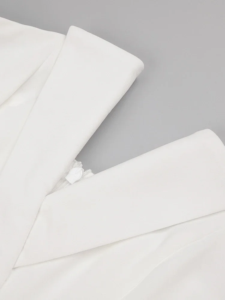 This two-piece set features a sexy, sheer mesh bodysuit with pearl beading, paired with a strapless jumpsuit in classic white. Elevate your evening look with this runway-worthy ensemble.