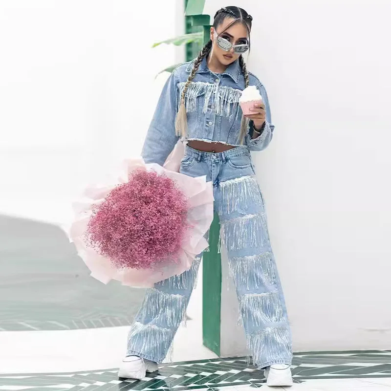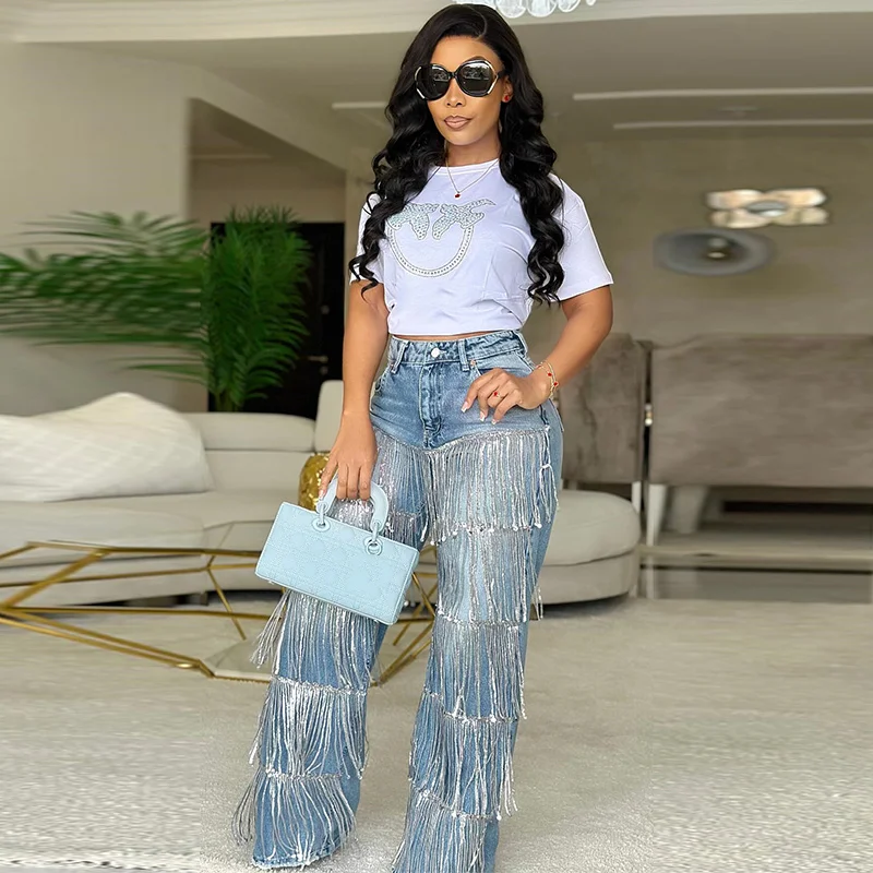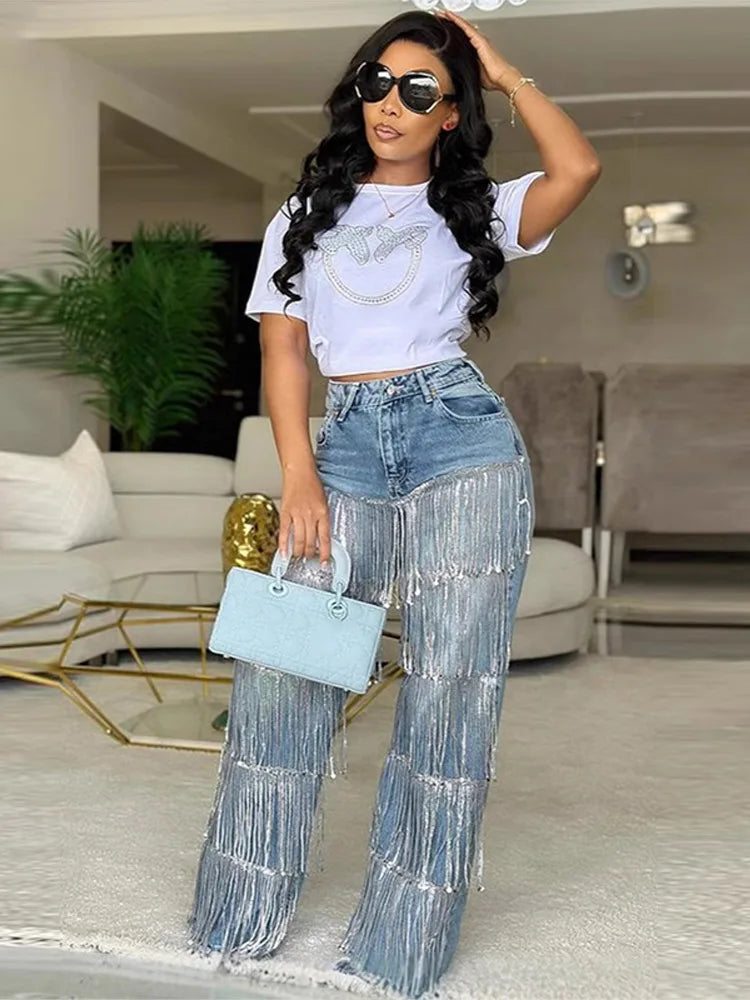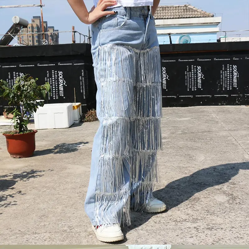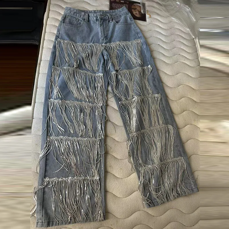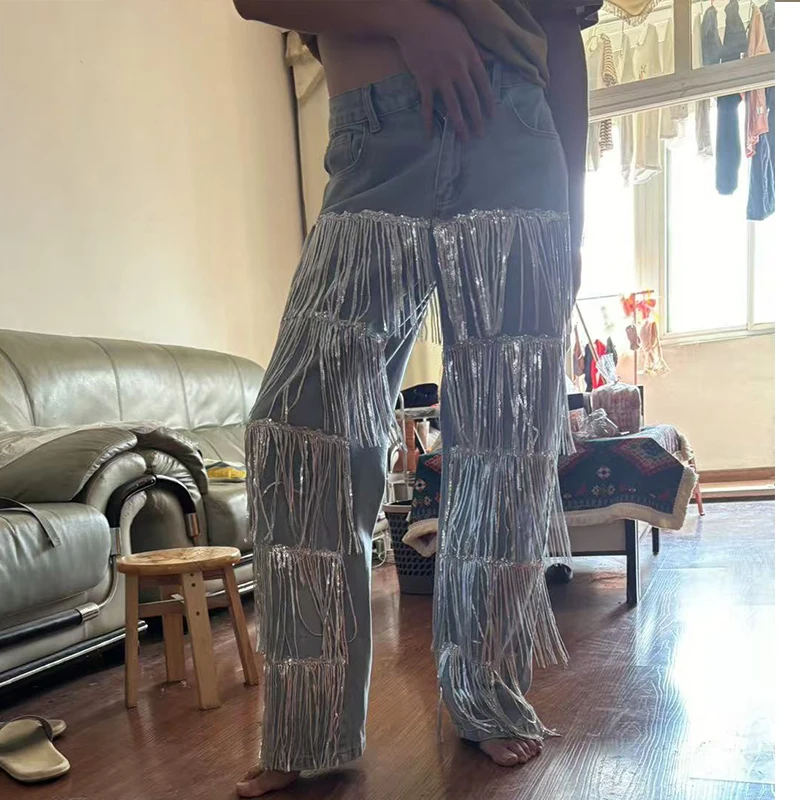 Sparkling Fringes Embellished Wide Leg Jeans Women Trendy Silver Tassel Denim Pants