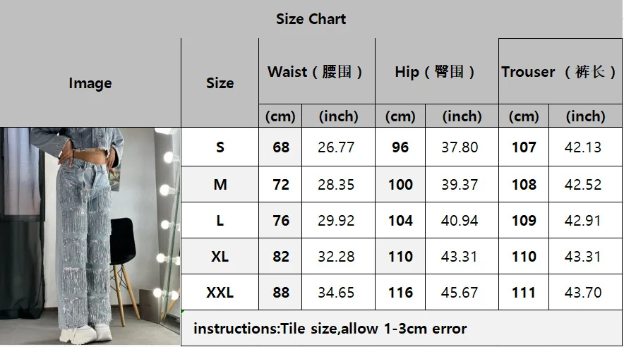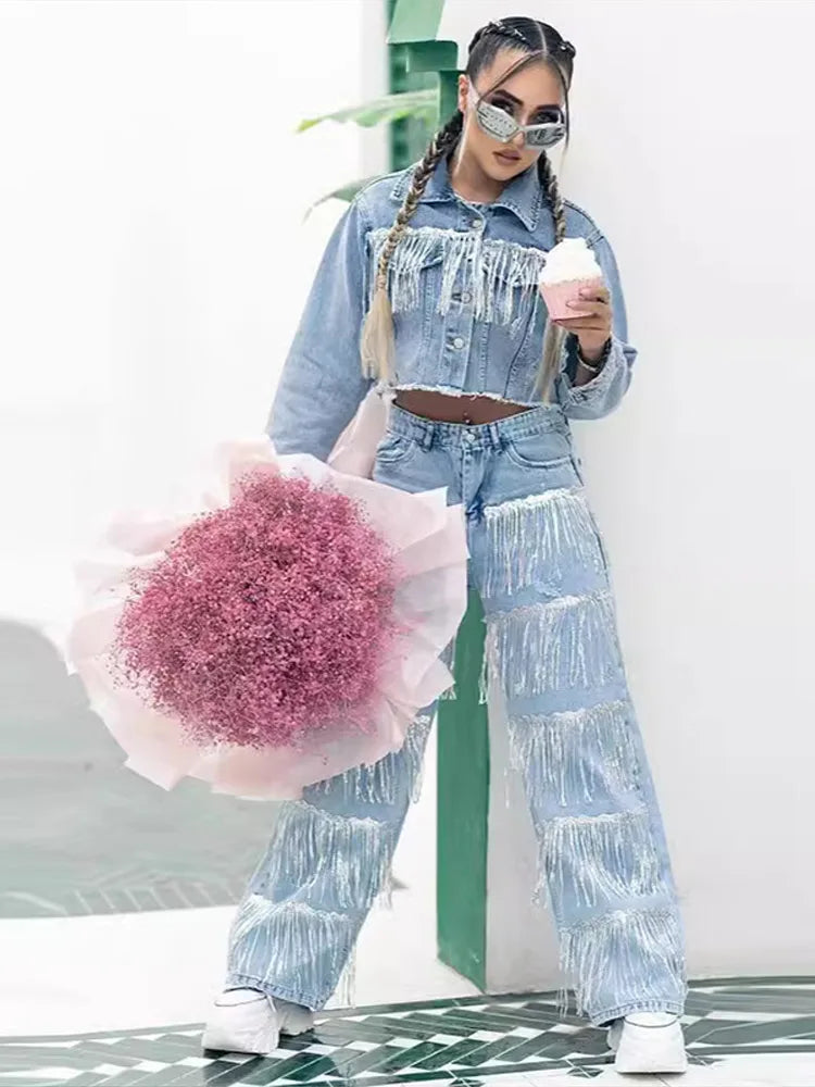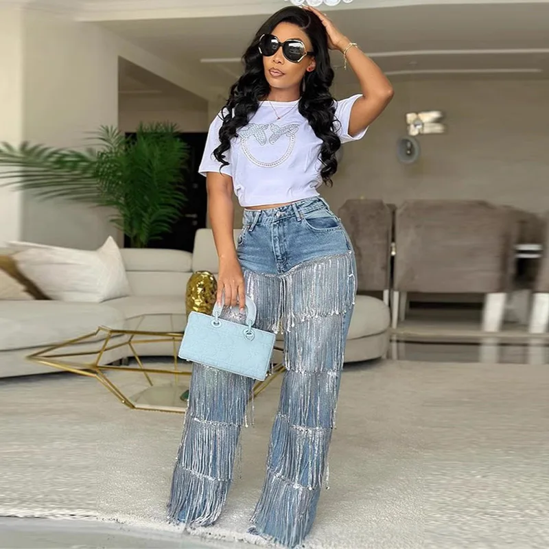 Introducing our stylish and trendy Sparkling Fringes Embellished Wide Leg Jeans for women. These glamorous denim pants feature silver tassel accents for a fashion-forward and Y2k inspired look. Upgrade your wardrobe and make a statement with these eye-catching jeans.