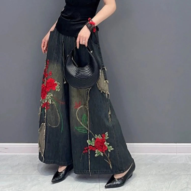 Women's Straight Jeans High-waist Ethnic Style Embroidered Drawstring Oversized Denim Wide-leg Pants