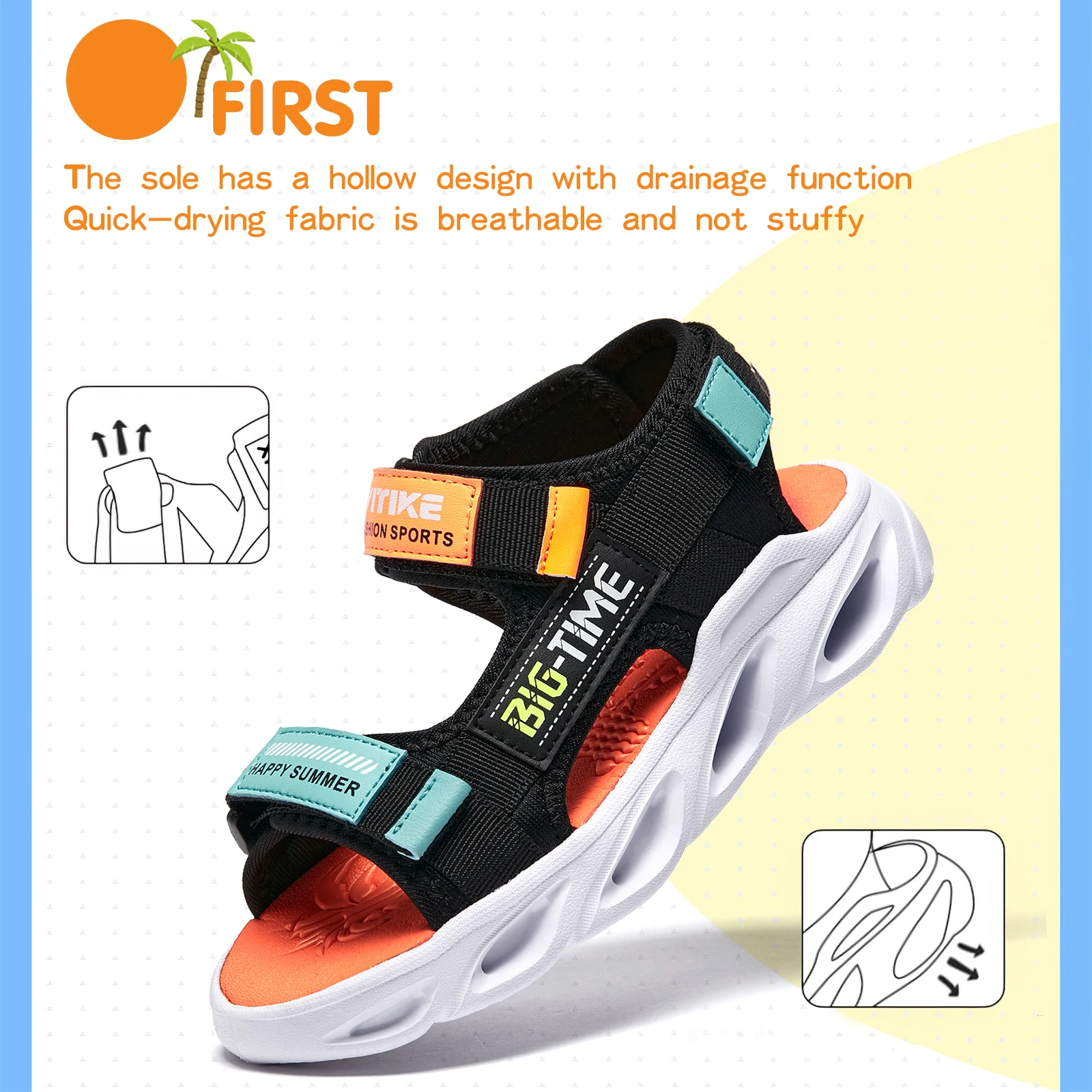 • *Kids Sports Sandals:Premium quality durable textile vamp with hollowed-out design enlarges the breathing space for kids feet for more breathable and comfy wearing. Dry and cool quickly, let your boys be away from smelly feet.