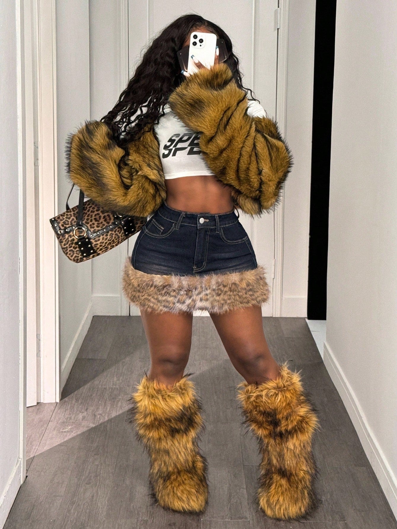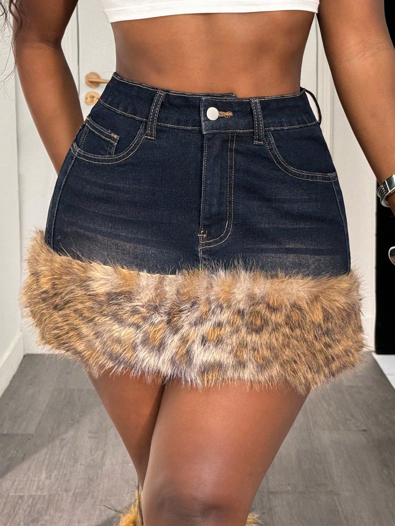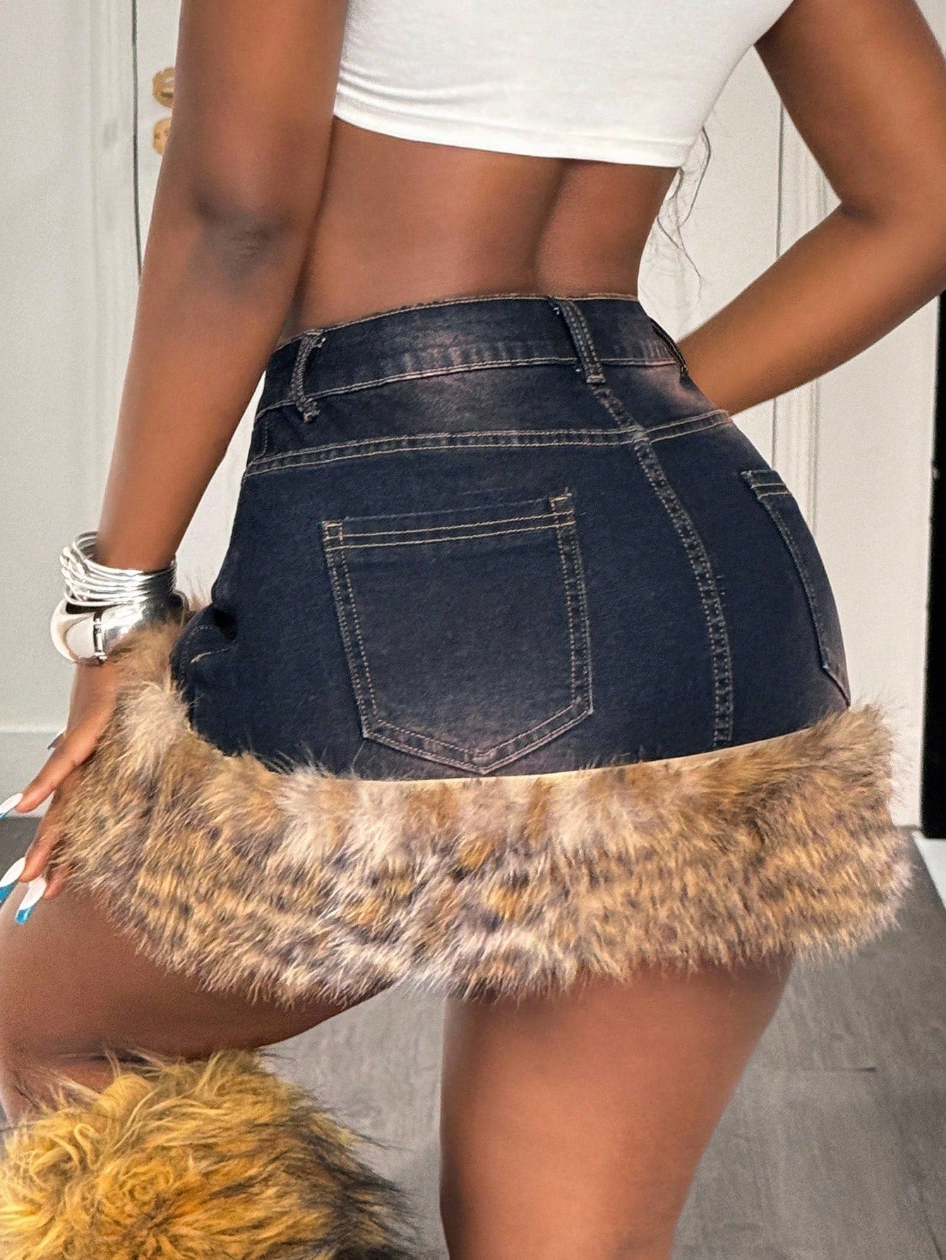 Trendy Slaydiva Denim Mini Skirt with Fur Collar for Street Style and Party Wear