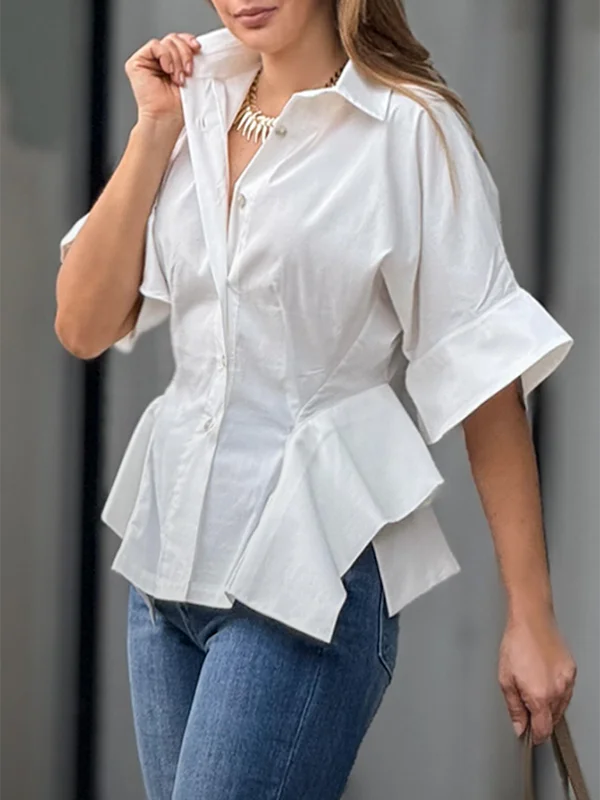 Cotton White Blouses Half Sleeve Loose Buttoned Solid Color Casual Asymmetrical