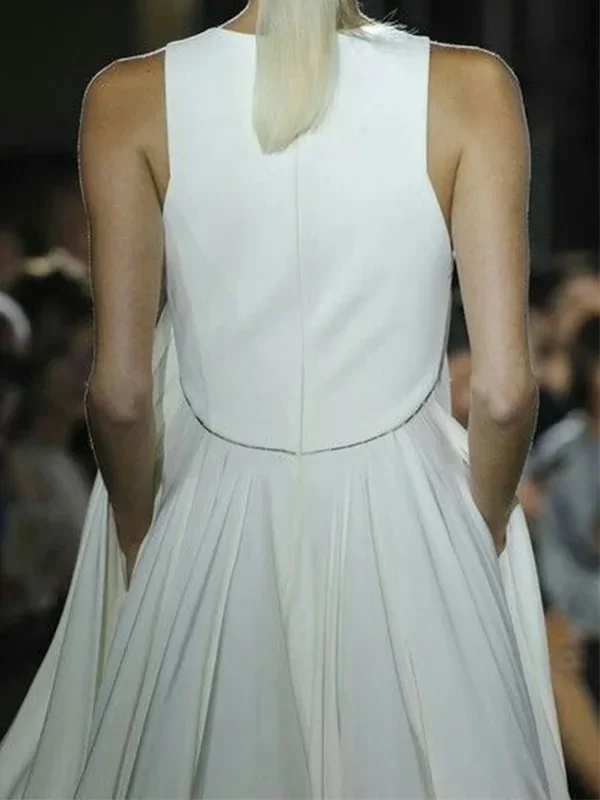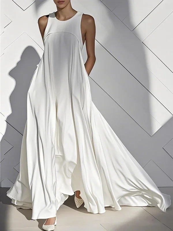 White Long Dress Summer Sleeveless Solid Color Round-Neck Pleated Elegant Evening Maxi Dress