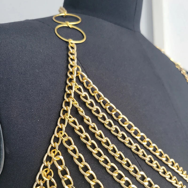 Elevate your lingerie game with our multi-layer body chain. Adorned with tassels and intricate metalwork, this Chest Accessory is a true jewelry piece. Designed for the confident woman, it adds a touch of sensuality to any bodycon crop top. Get this Wholesale price for a limited time only