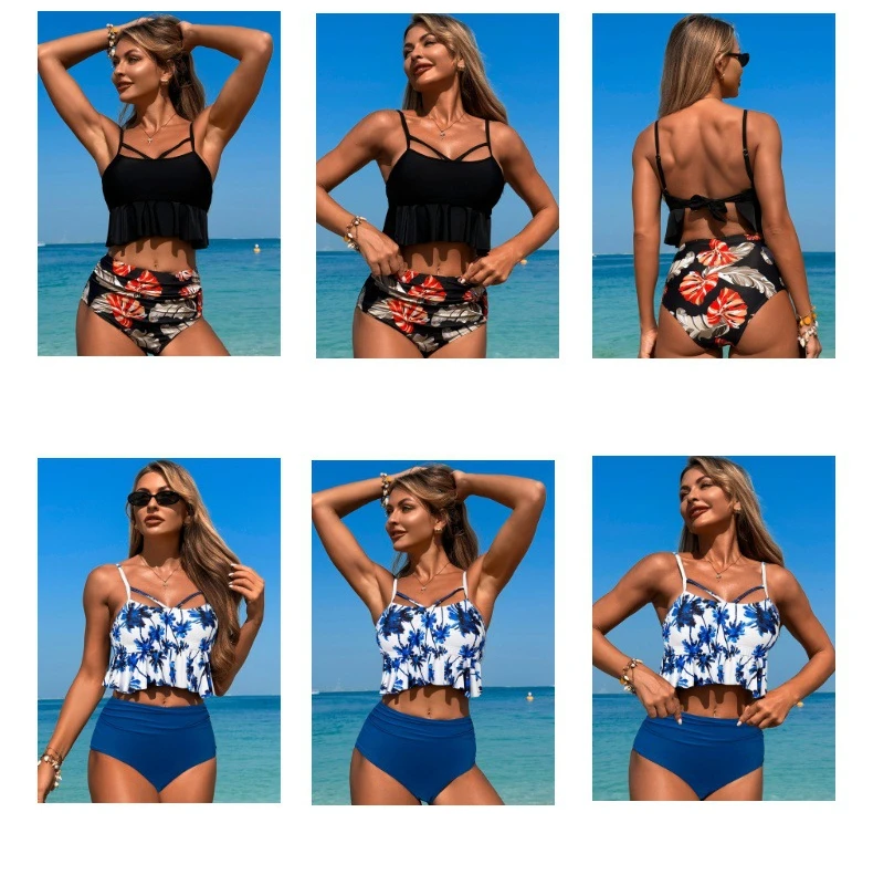 Women's Bikini Set High Waist Tankini Hollow Out Ruffle 2 Piece Swimsuit with Chest Cushion