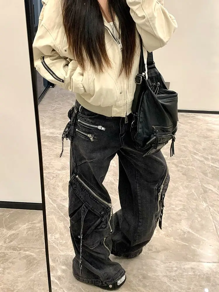 Women's Black Cargo Baggy Jeans Line Y2K American High Street Harajuku Aesthetic Vintage Design Wide Leg Jeans Trousers Clothing