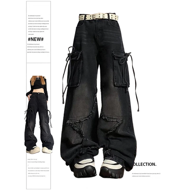 Women's Black Gothic Baggy Cargo Jeans with Star Harajuku Y2k 90s Aesthetic Denim Trousers Emo 2000s Jean Pants Vintage Clothes