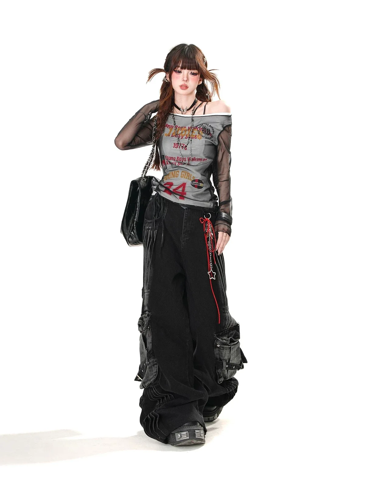 Women's Black Gothic Jeans Cargo Baggy Y2K Harajuku Fashion Streetwear 2000s Style Aesthetic Casual Retro Denim Pants Clothing