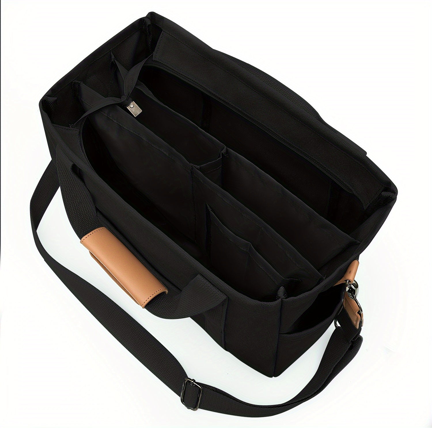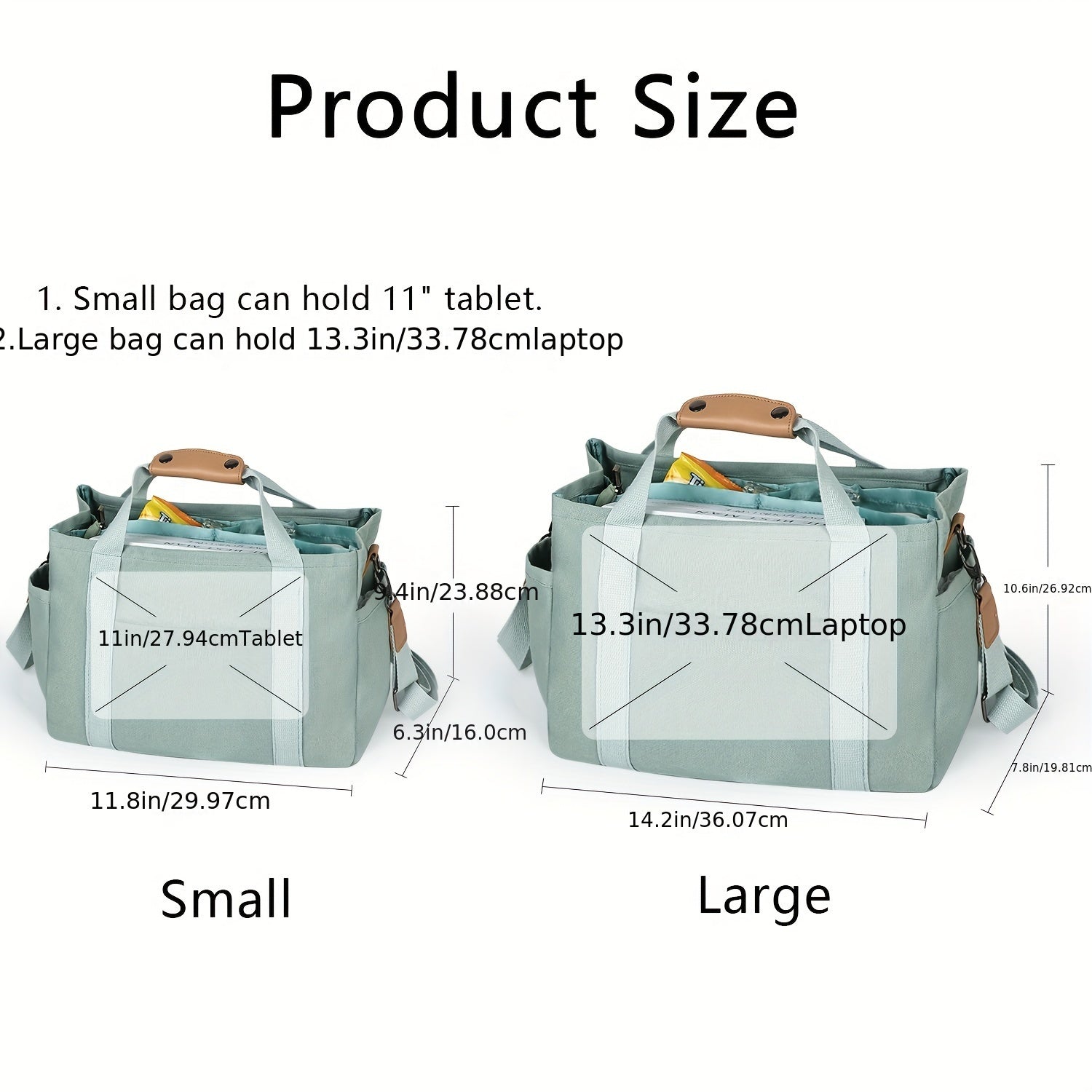 [Multi-Pockets] This tote bag has three inner compartments, fitting items like your phone, tablet, and a 13.3-inch laptop. One inner pocket with zipper. One front pocket with zipper. One back pocket. Two side pockets.