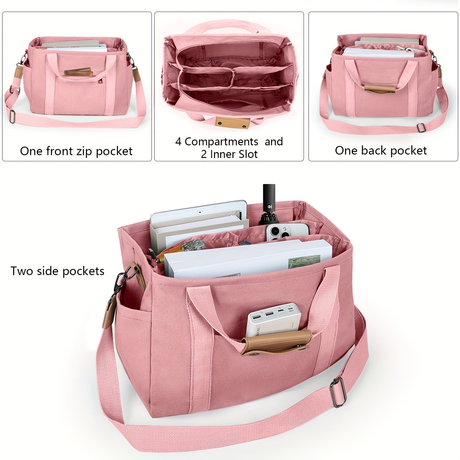 This spacious canvas tote combines style and functionality with multiple zippered compartments and a generous 14.5x9.8x5.5 inch capacity. Designed for versatility, it transitions seamlessly from work to travel with its adjustable crossbody strap. The pink hue adds a fashionable touch to this practical handbag, making organization effortless for busy professionals and parents alike.