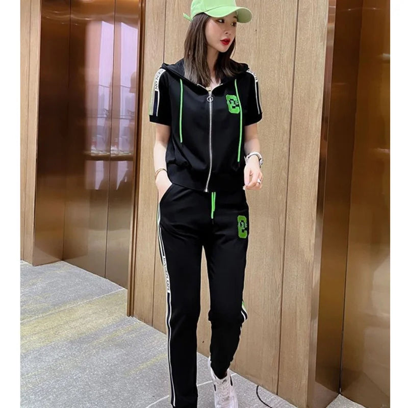 Women's Fashion Tracksuit Casual Suit Short Sleeve Hooded Top Pants Two Piece Set For Women