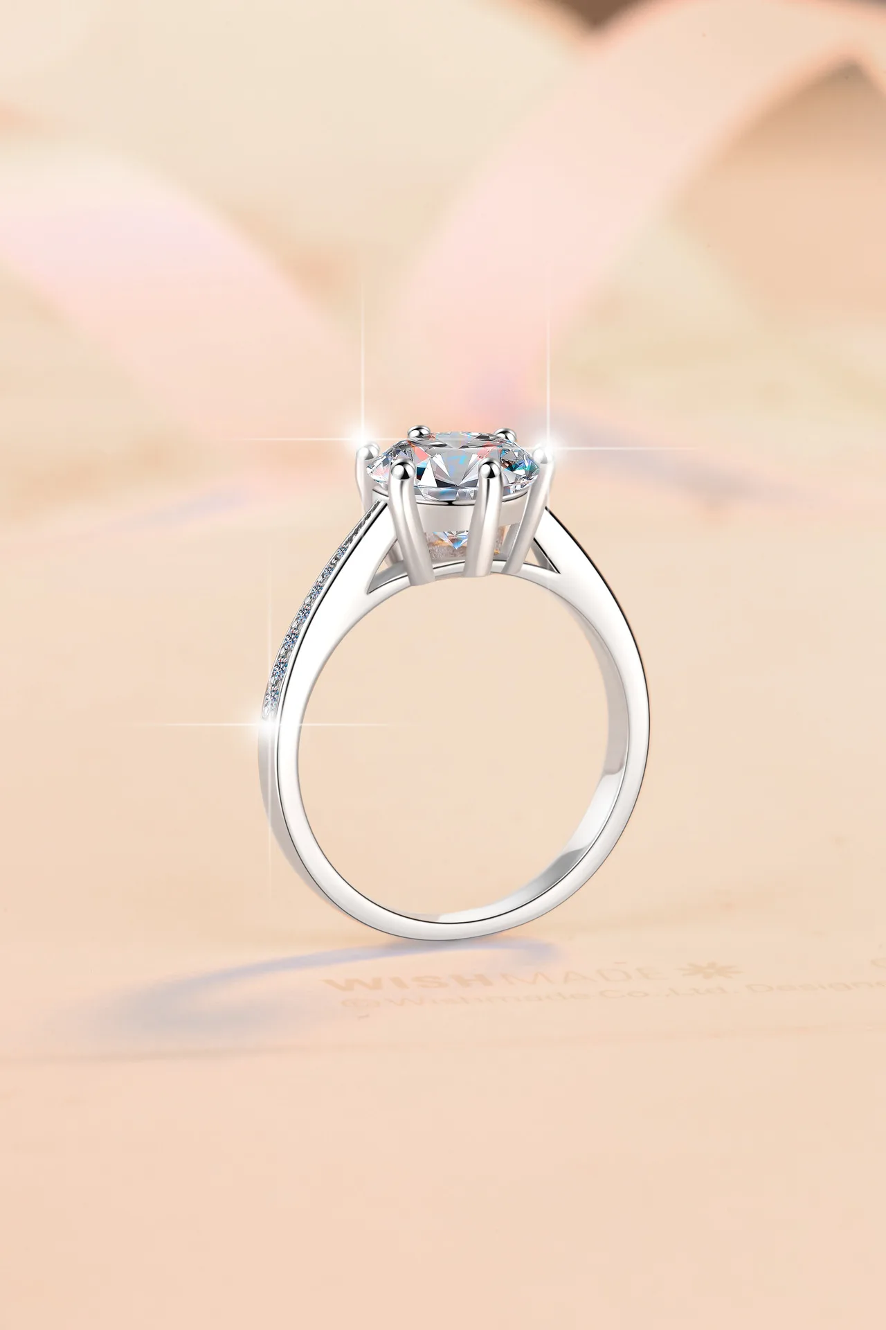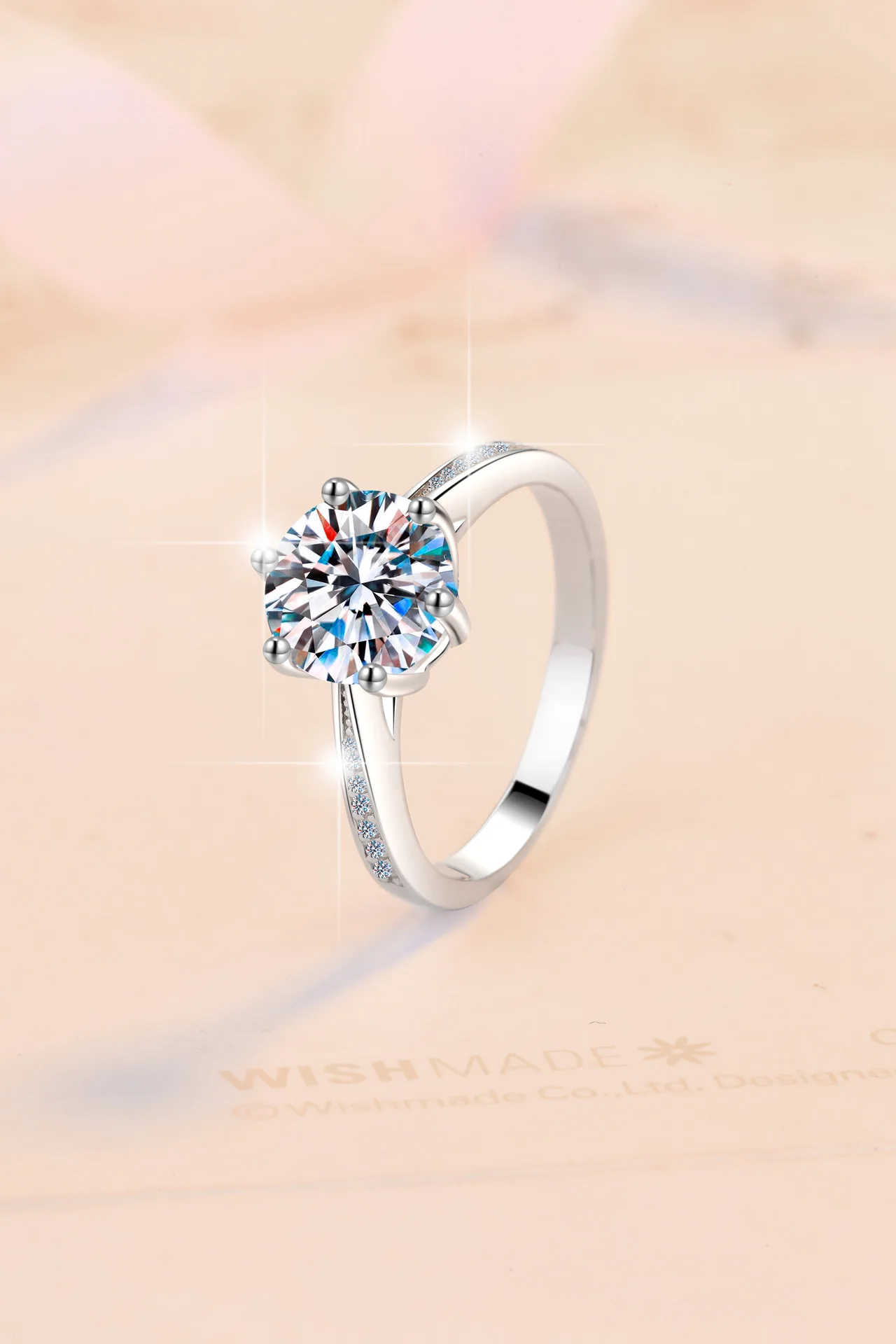 The six-prong setting securely holds the Moissanite, enhancing its brilliance and sparkle, making it a standout piece in any collection.