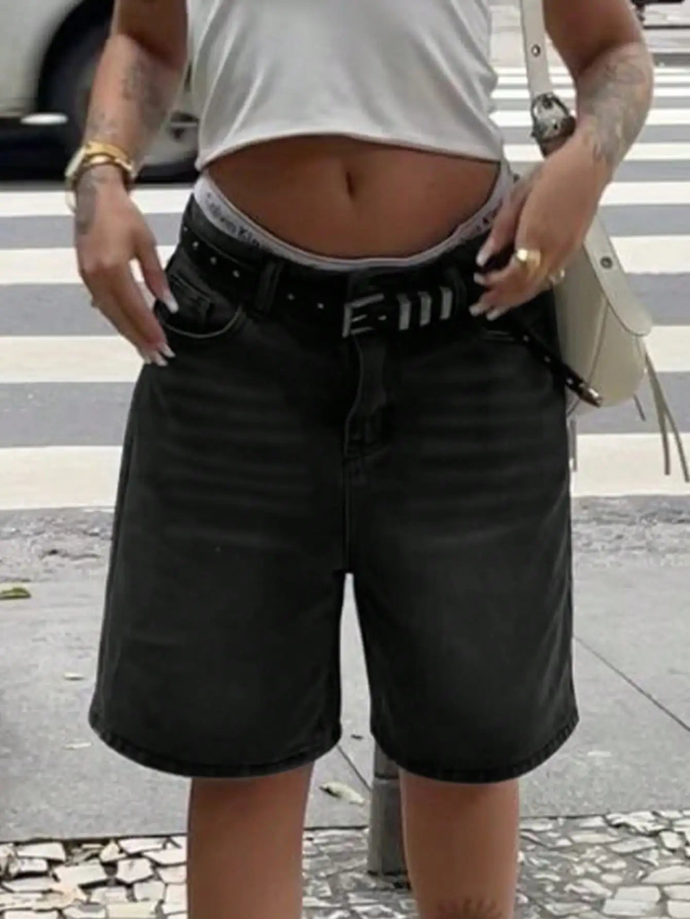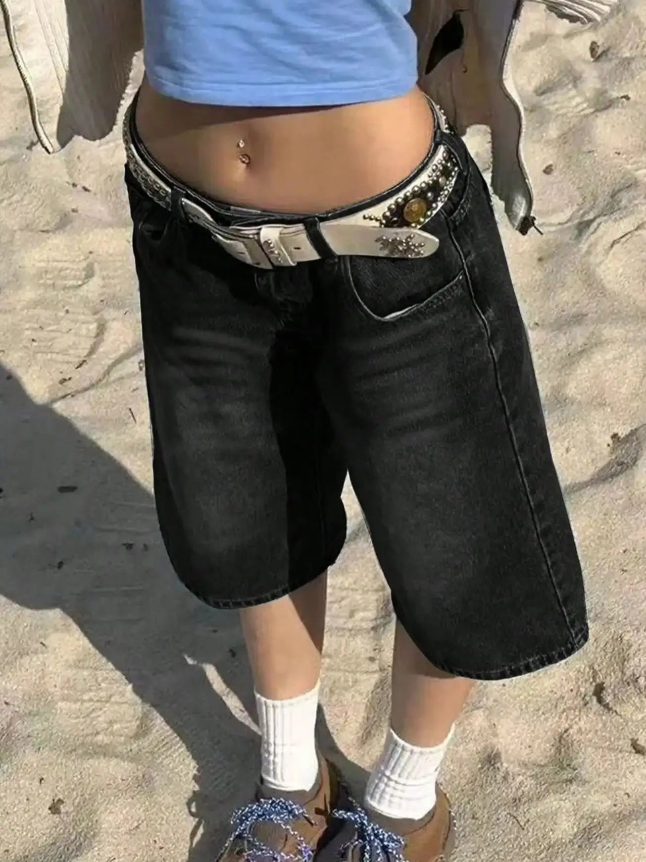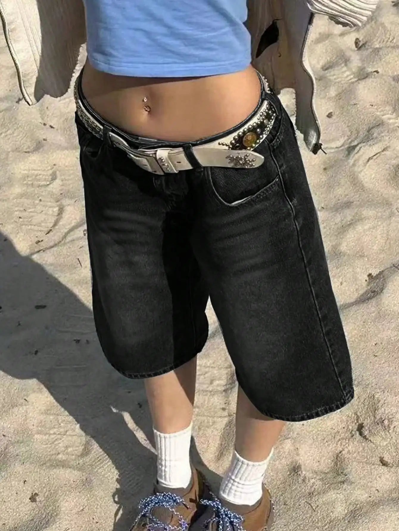 Y2K Street Vintage Washed Slant Pocket Cat Whiskered Trendy Style Wide Leg Bermuda Jeans Knee Length Denim Jorts Casual Shorts C