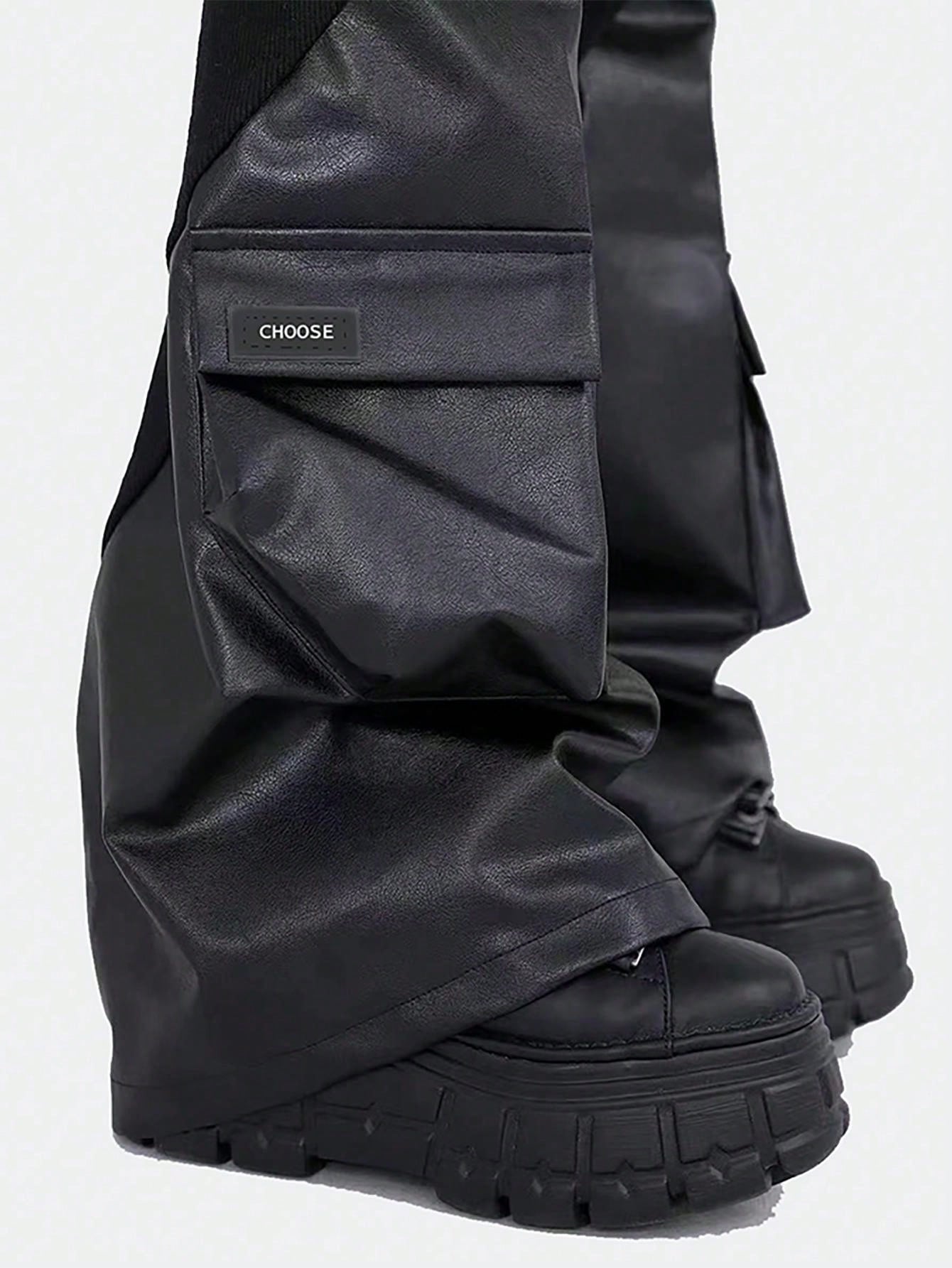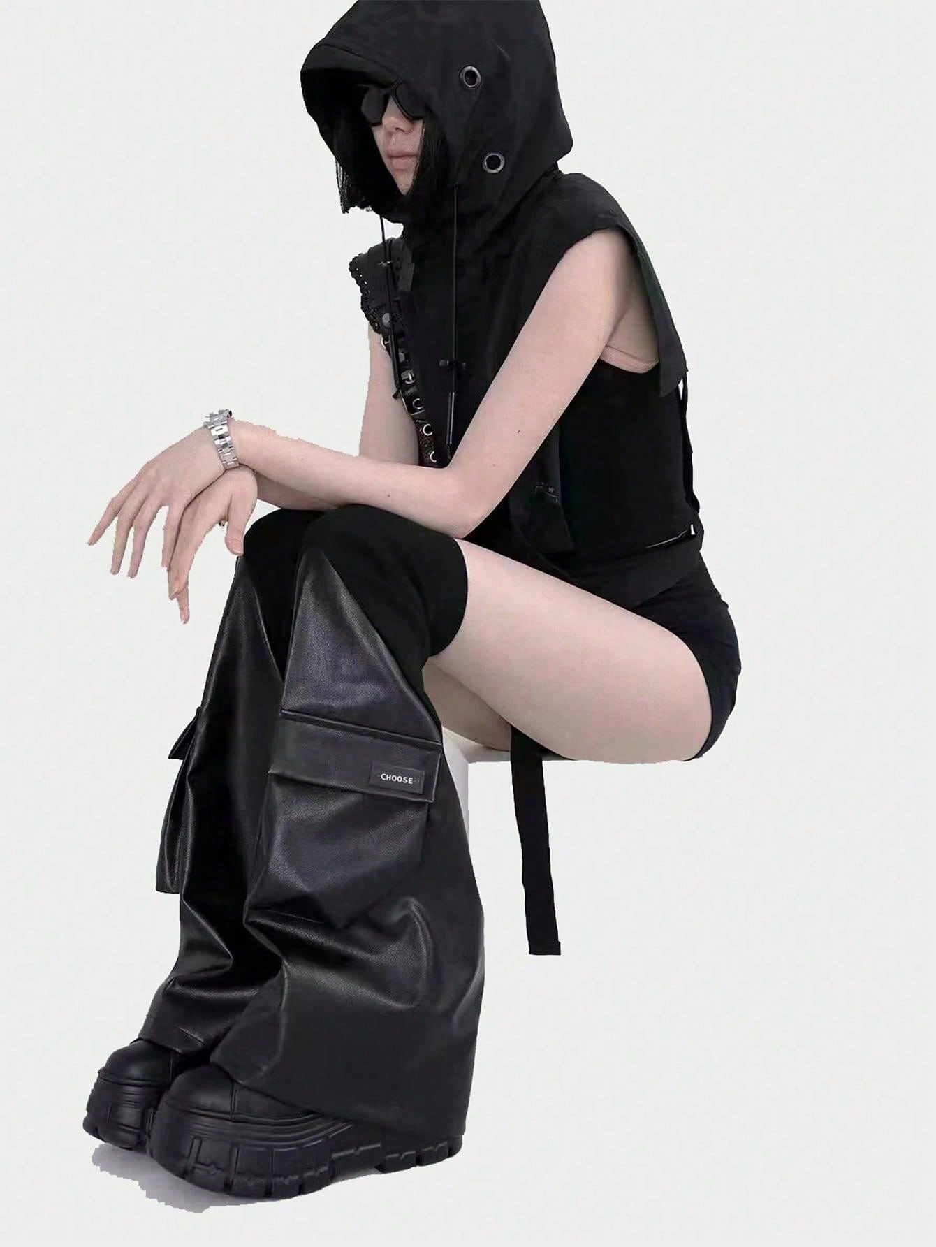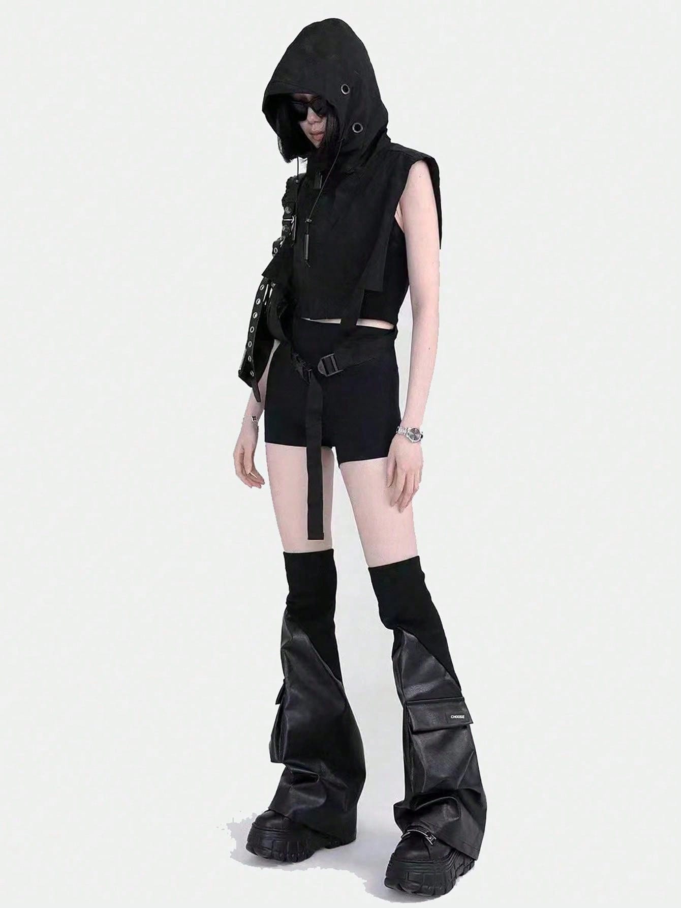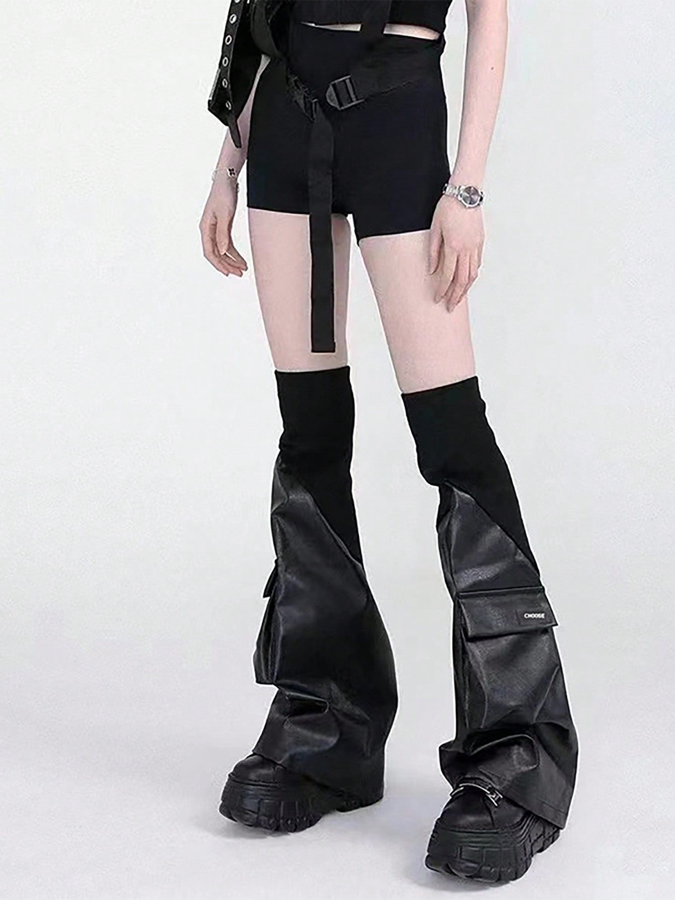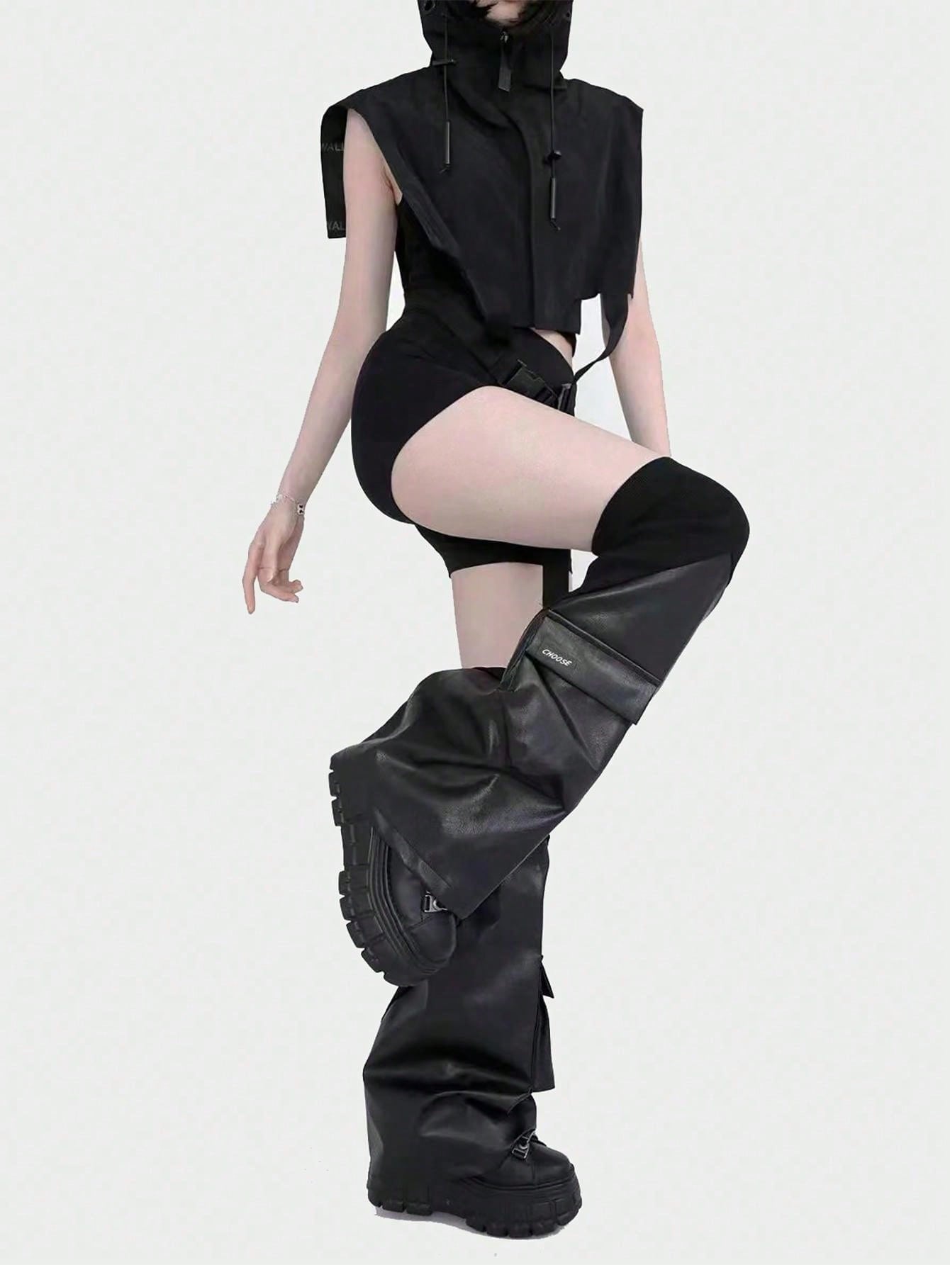 Y2K Style Black Faux Leather Ribbed Punk Rock Leg Warmers - Slimming & Shaping Pocket Design