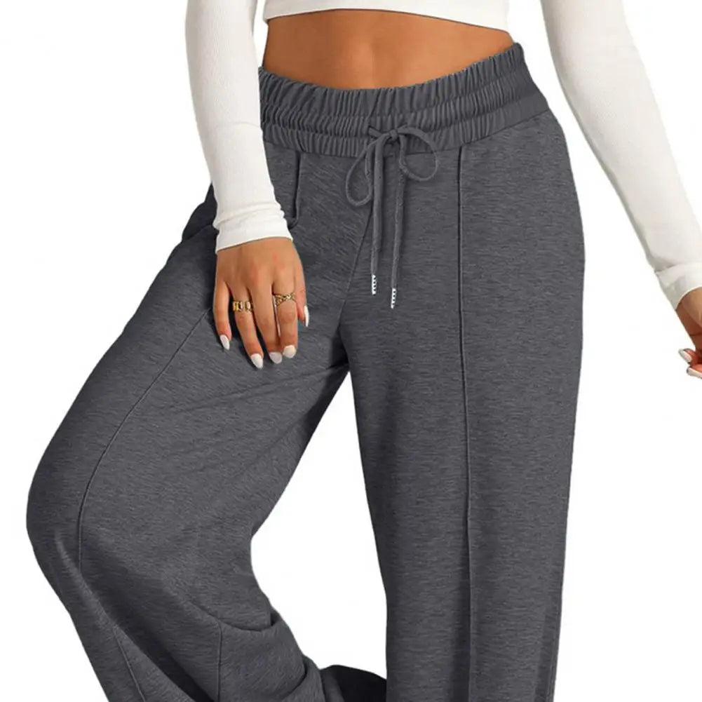 Women Spring Wide Leg Sweatpants Elastic Drawstring Waist Solid Color Sport Pants Pockets Baggy Lounge Pants